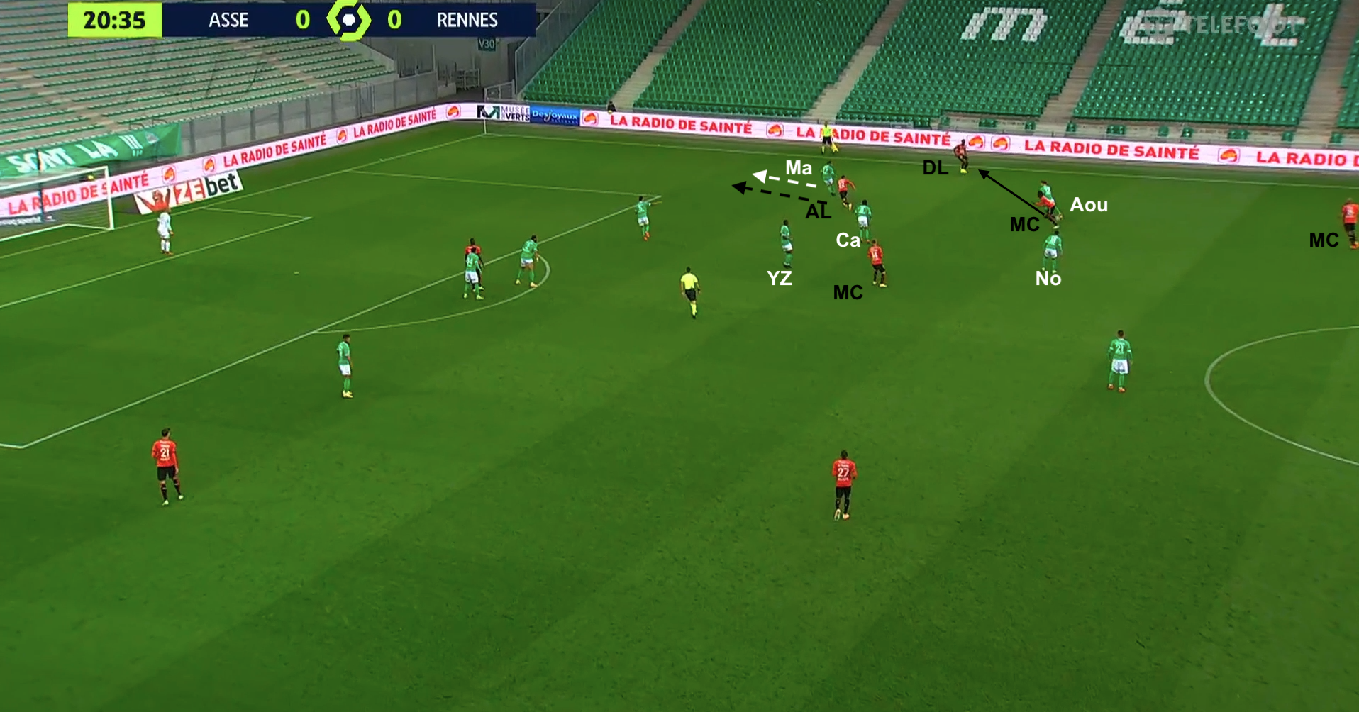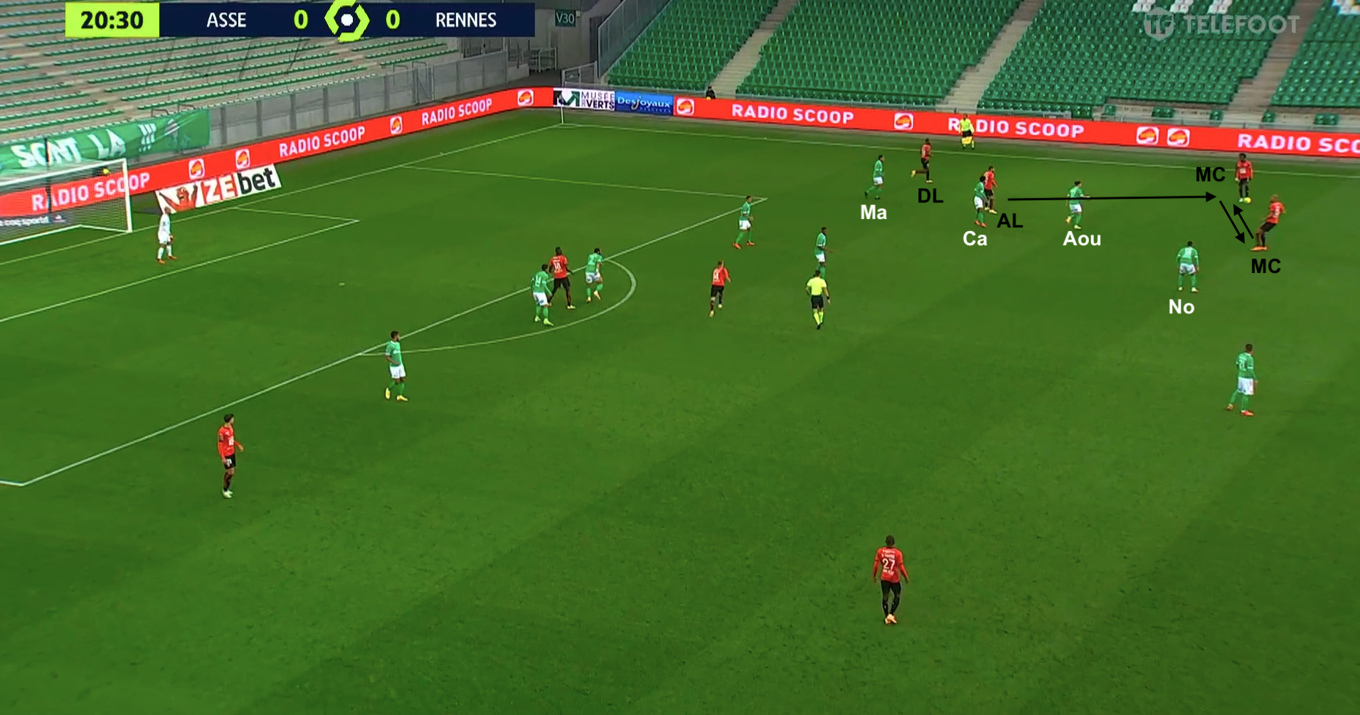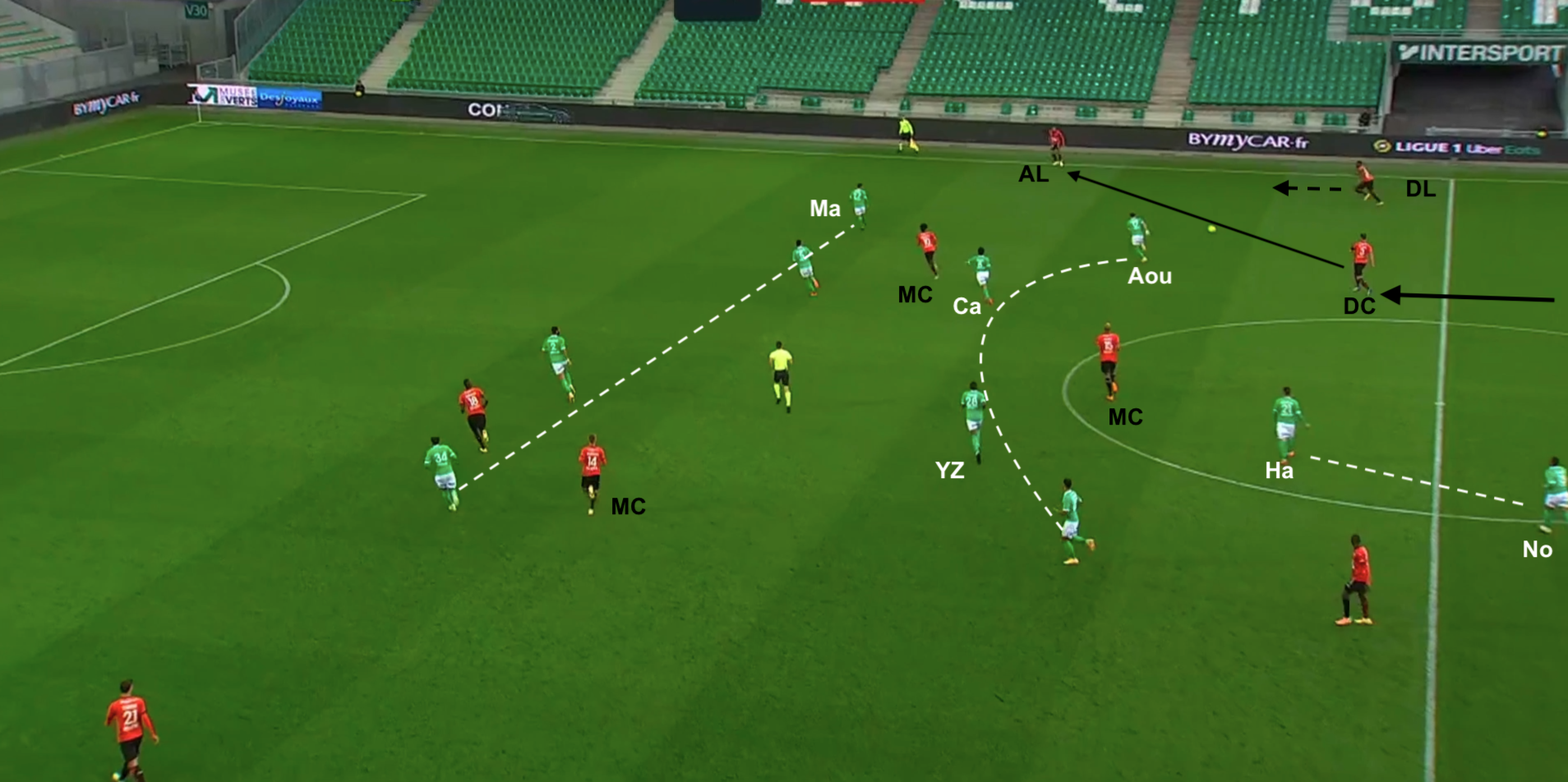 Camara reçoit le ballon et le garde en attendant une solution. On remarque facilement l'alignement de la défense adverse sur la ligne médiane et le pressing haut effectué par les autres joueurs bretons. Ça veut dire qu'il y a de la place en profondeur et les 4 offensifs de l'ASSE se tiennent prêts : Bouanga part trop tôt et se trouve hors-jeu...