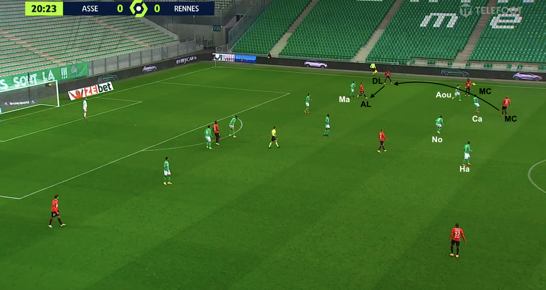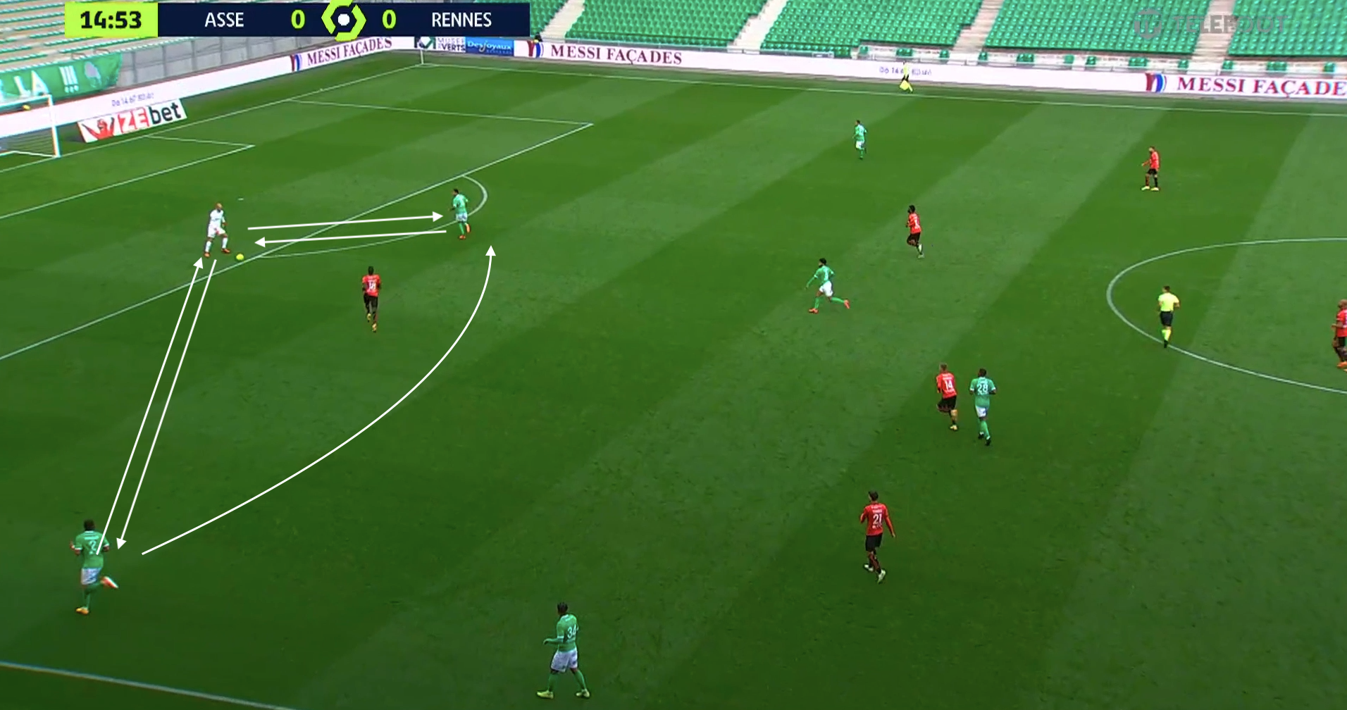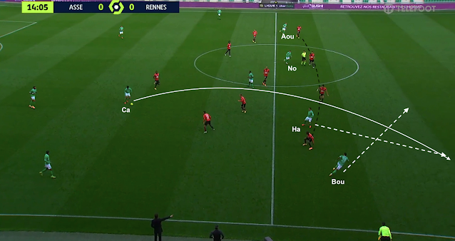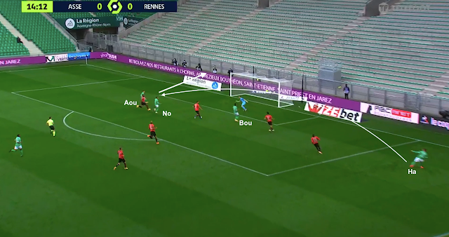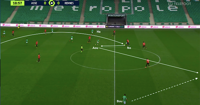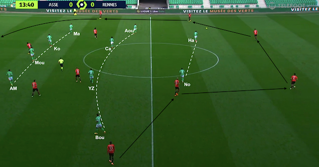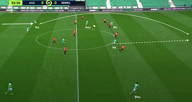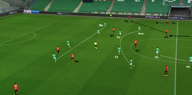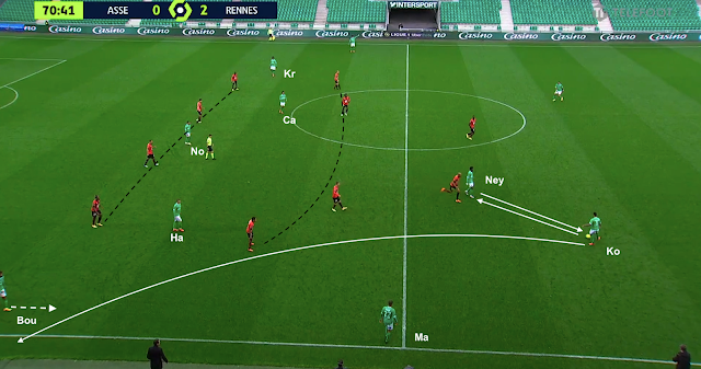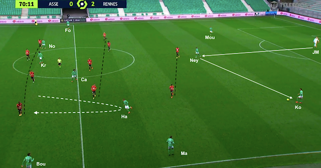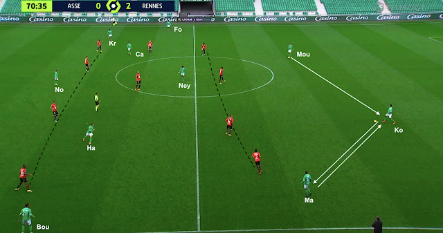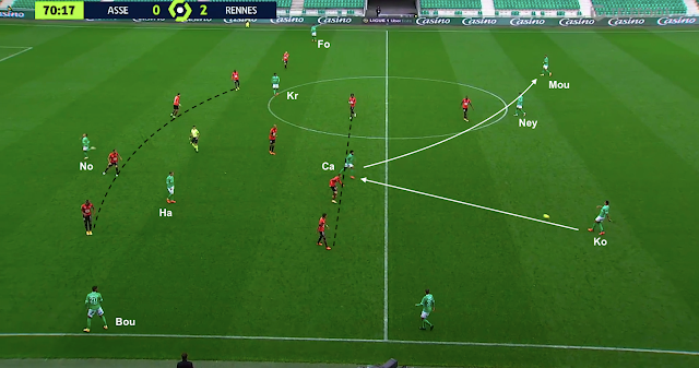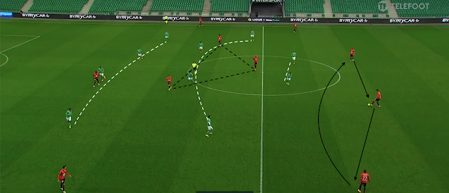 Ce n'était qu'un exemple, mais ce genre d'action a souvent été proposé par Rennes : du jeu à 3 ou 4 dans les couloirs avec des milieux qui apportent le surnombre. Ce surnombre est inhérent aux confrontations entre deux systèmes différents, à deux contre trois milieux, mais normalement un des attaquants doit compenser - ça a rarement été le cas dans ce match. Et si le but du break peu après la pause n'a pas été issu d'une action construite, mais d'un pressing haut, il y avait le même déséquilibre, dans le même couloir, où deux Stéphanois ont dû défendre contre trois adversaires...