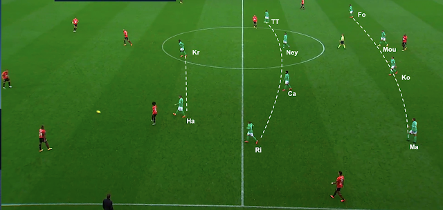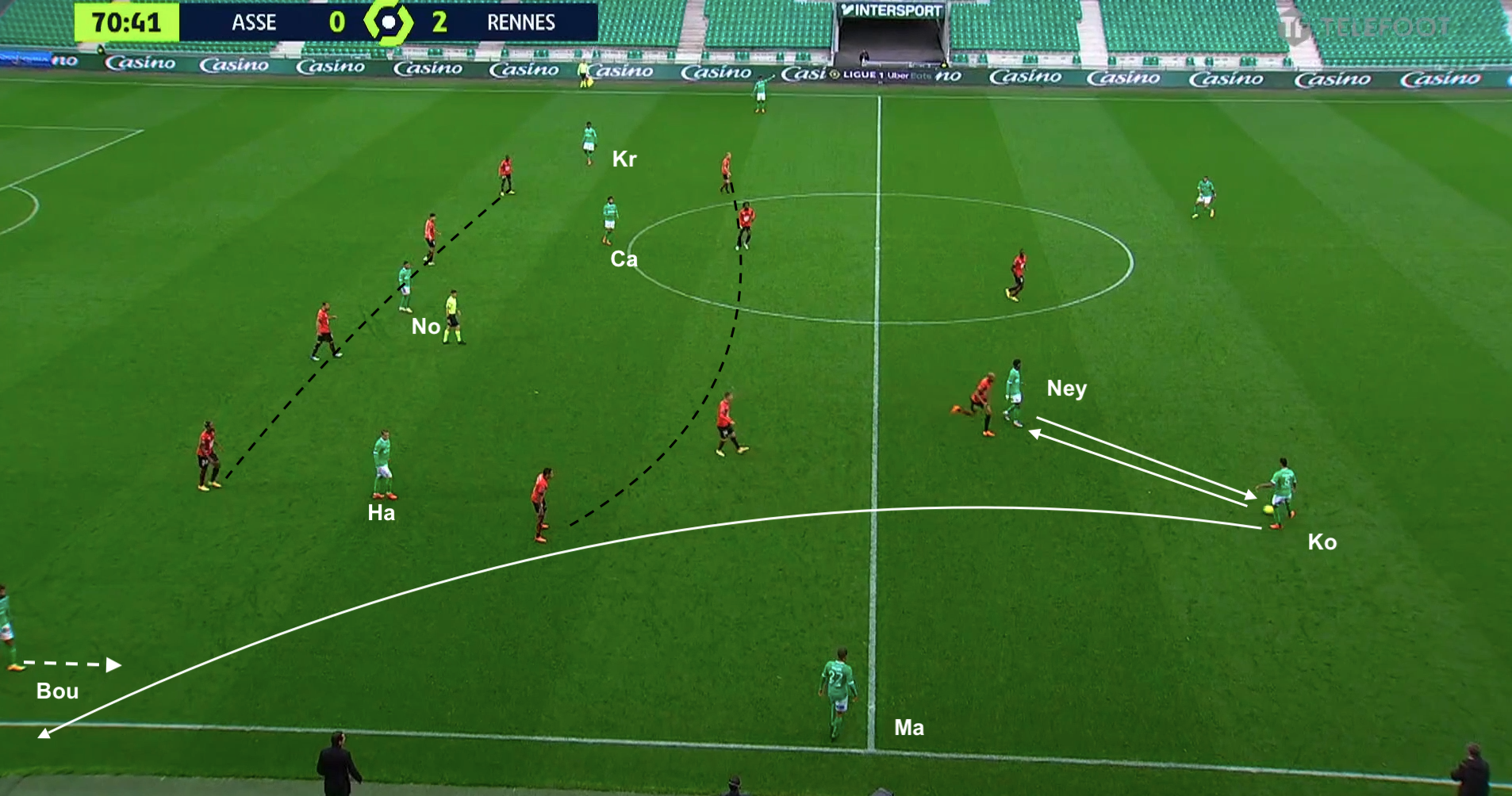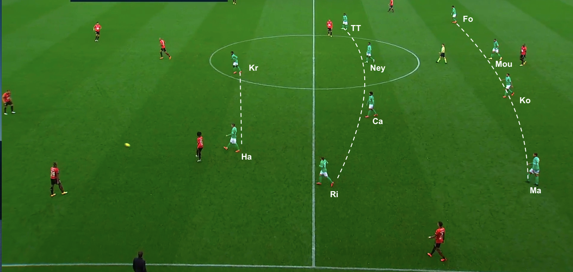 Pendant que le défenseur gardait le ballon, Nordin avait fait un autre appel en profondeur, toujours pas servi. Il n'y a pas de solution de passe à travers le bloc rennais, donc le ballon circule en dehors et arrive de nouveau à Kolo :