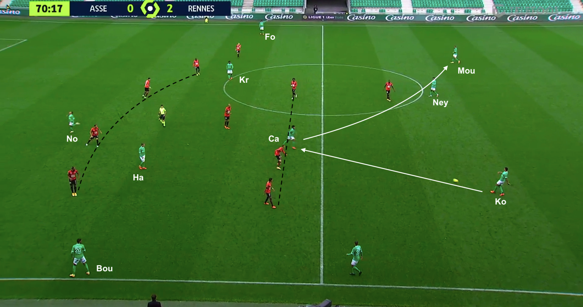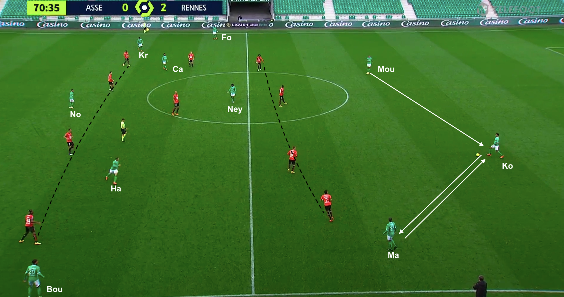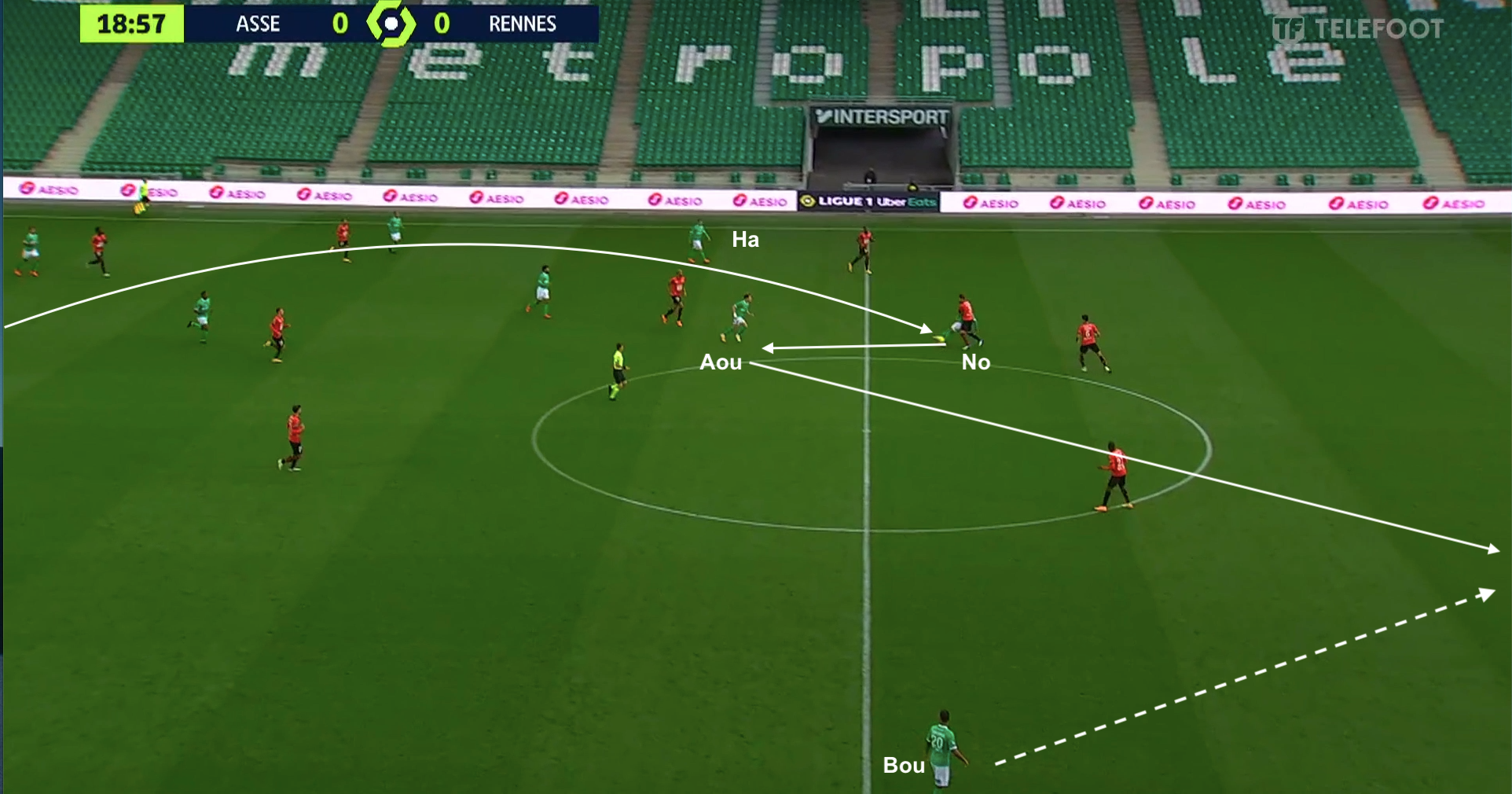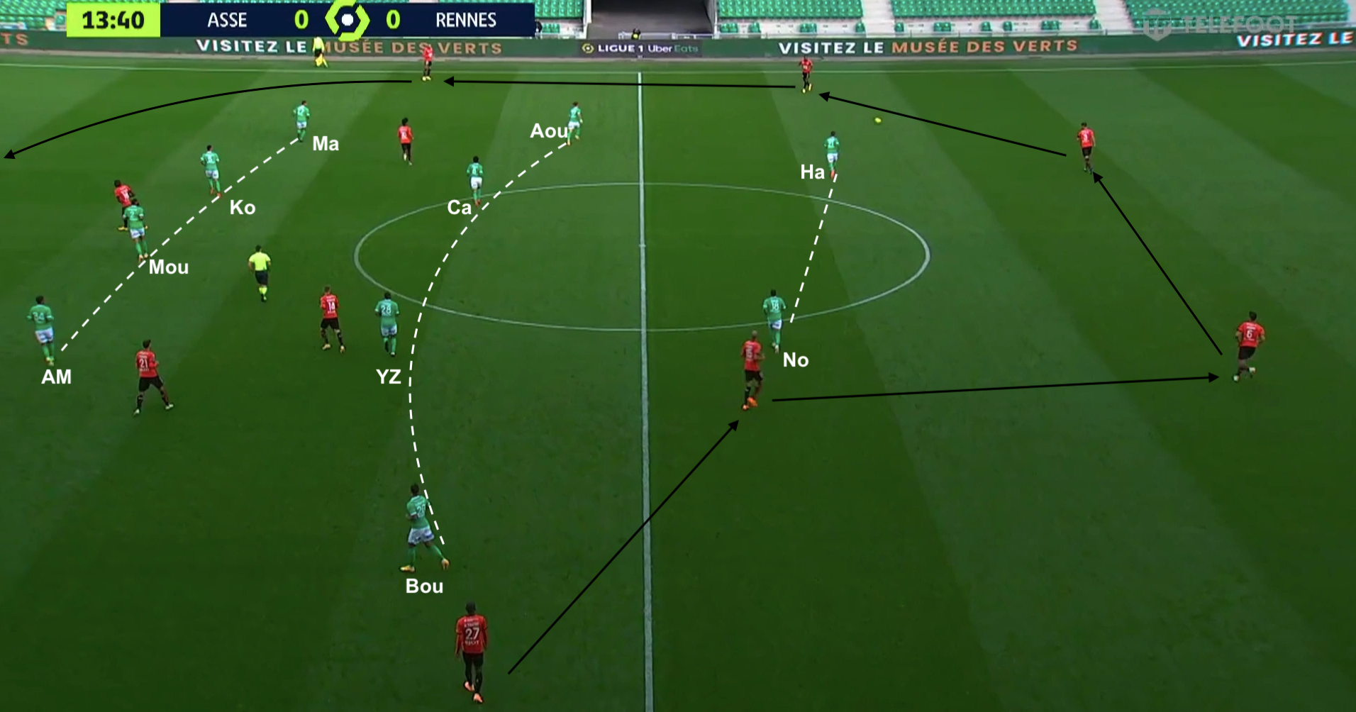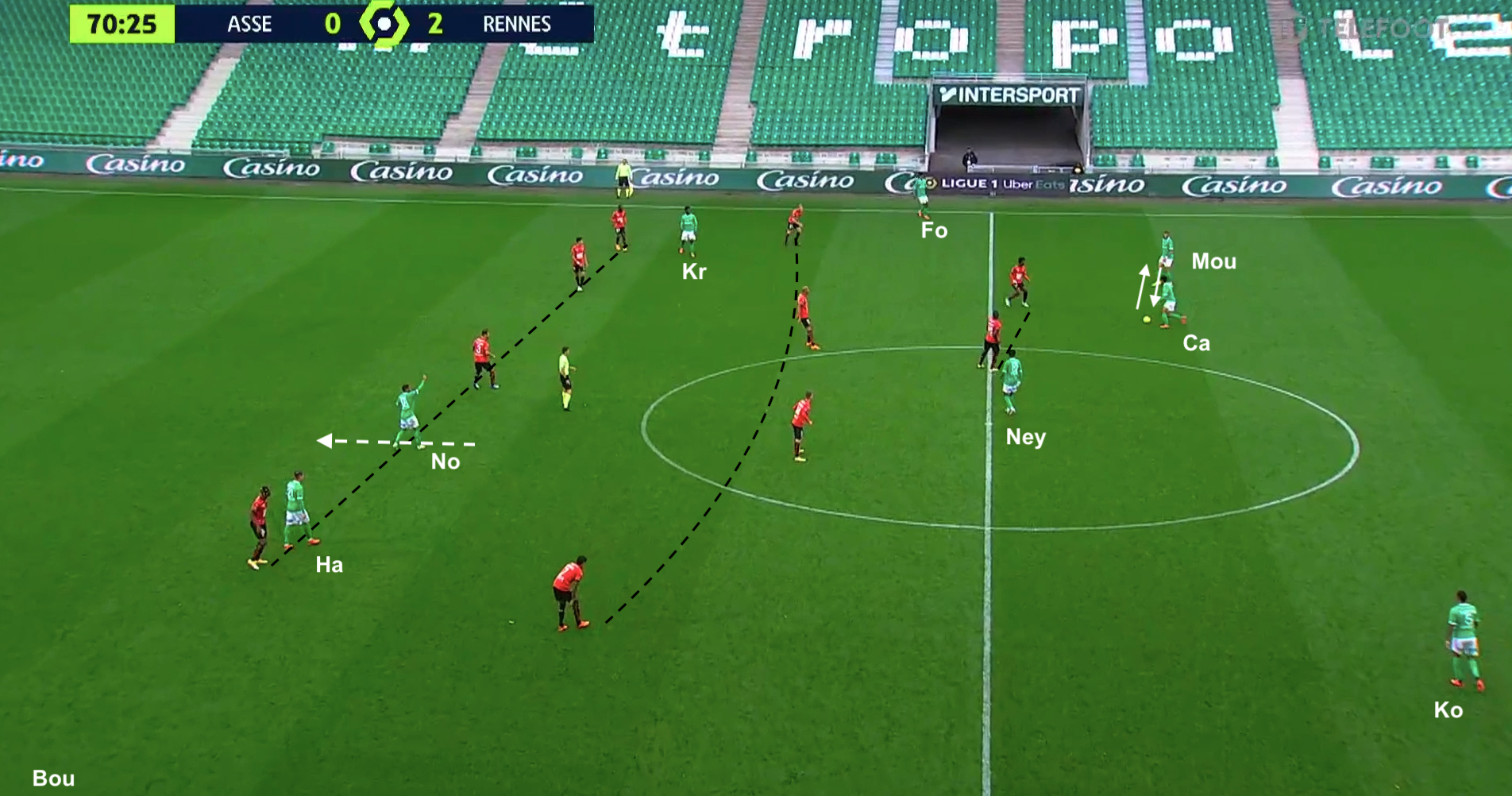 Les seuls changements par rapport au 11 de départ habituel ont été forcés par les blessures, Neyou et Fofana, incertains avant le match, ont laissé la place à Youssouf et Moukoudi. Dans l'exemple qui commence avec cette capture d'écran, les Rennais font circuler le ballon de gauche à droite pour contourner le bloc stéphanois, mais le centre de l'ailier arrive dans les gants de Moulin. Qui relance avec Kolo :