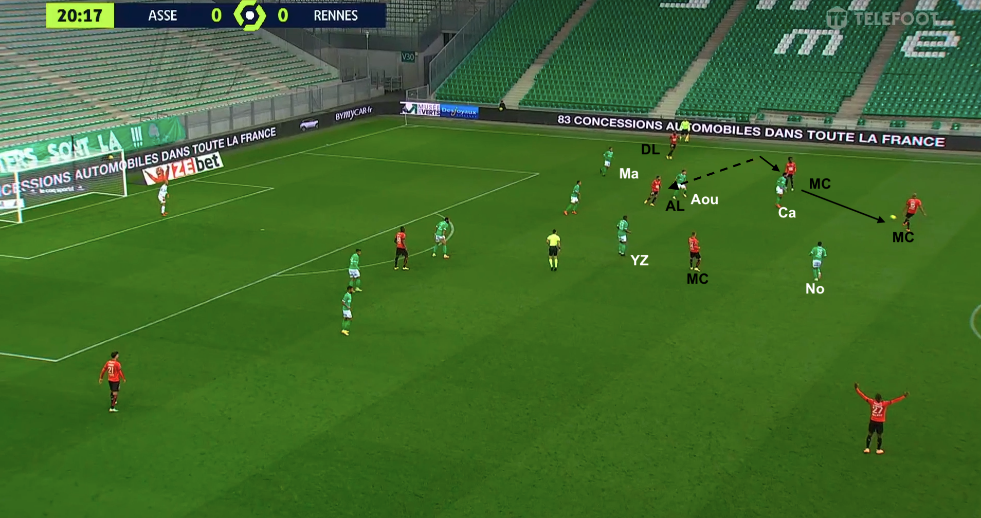 Le duo Camara-Youssouf (Camara-Neyou en 2MT) était en infériorité numérique contre le trio breton et n'a pas été aidé par d'autres coéquipiers. Dans cette exemple tout est bien en place, un bloc en 4-4-2, le premier rideau coupe les passes vers la sentinelle adverse et les deux autres milieux rennais sont pris. Mais quand il y a un défenseur central qui monte balle au pied, un déséquilibre est créé à la gauche de la défense :