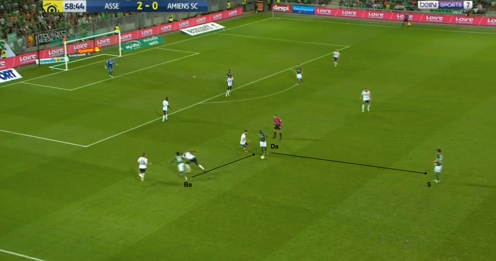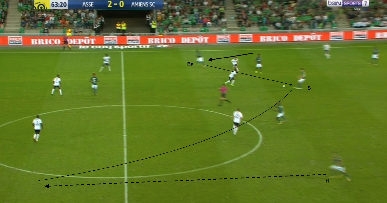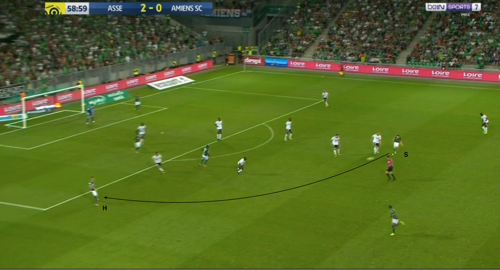 L'entrée de Maiga pour Diousse marque la fin des mauvais choix stéphanois dans la sortie de balle. Par contre, ce n'est pas directement lié au nouvel entrant, comme on peut le voir sur la toute première action après le changement :