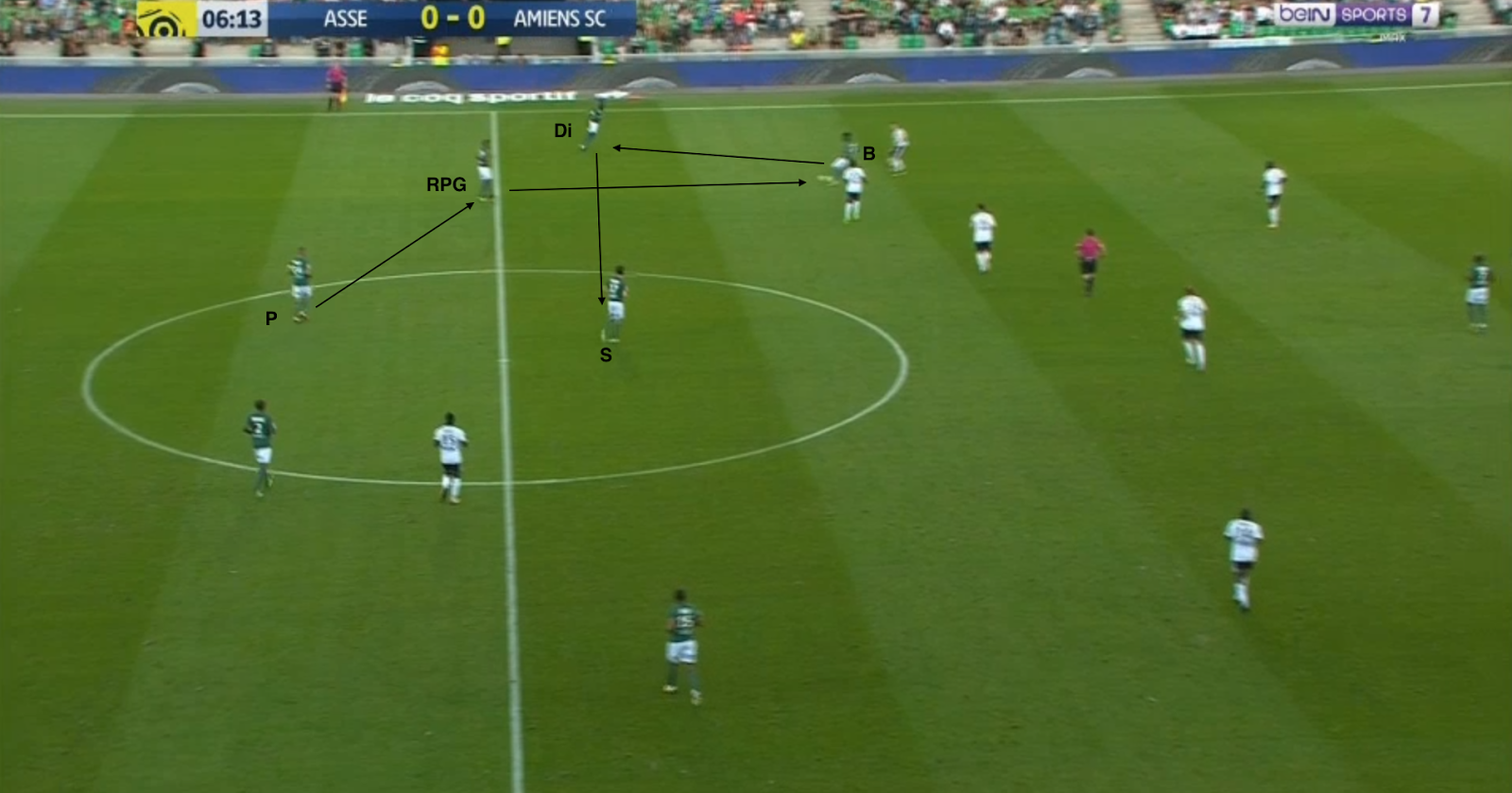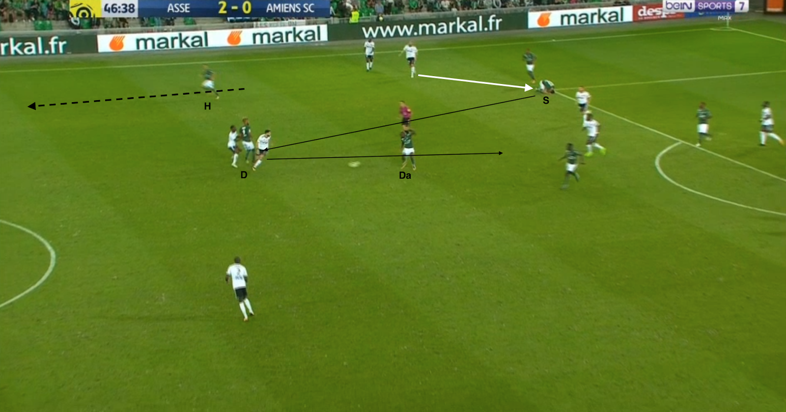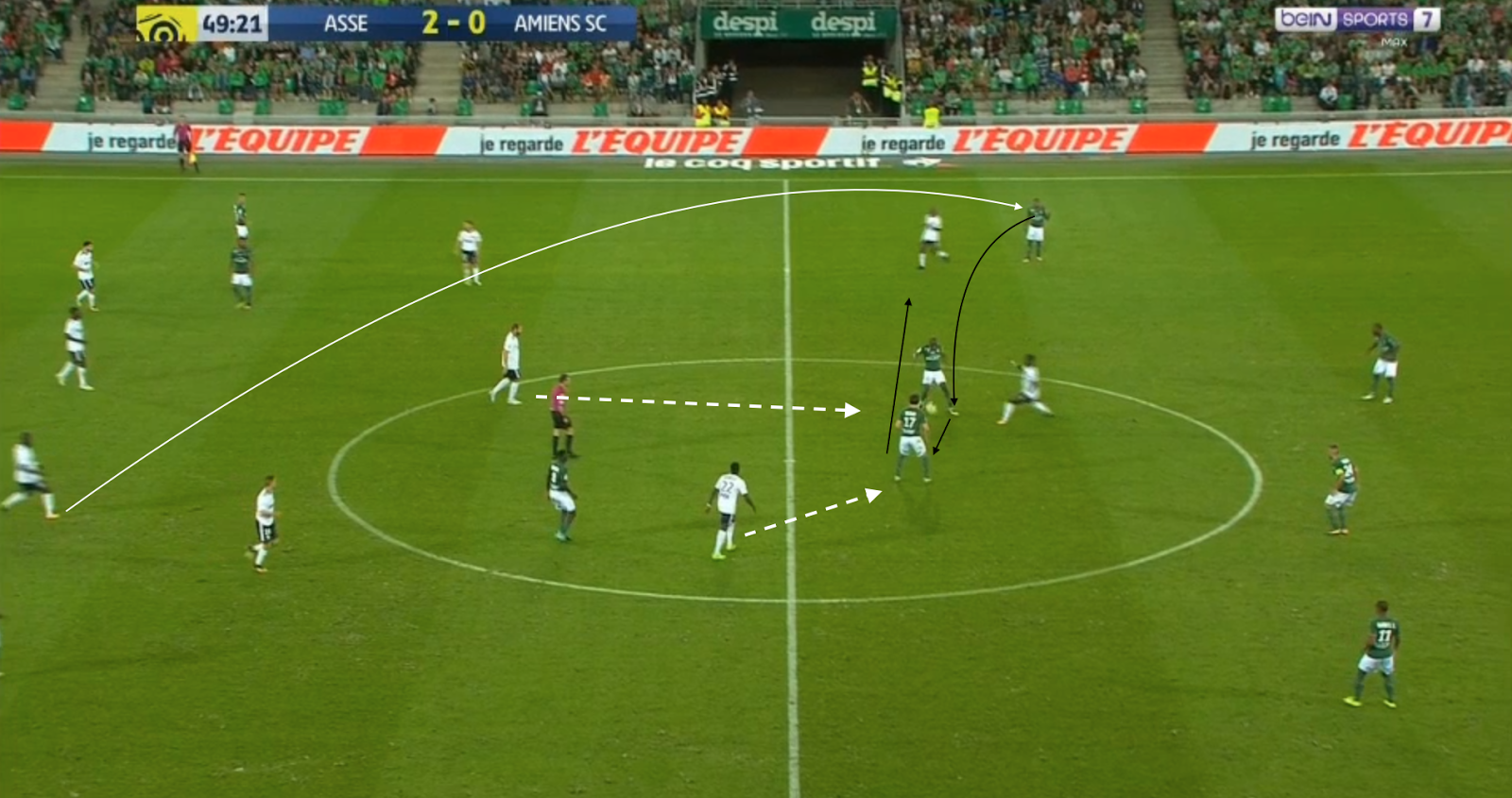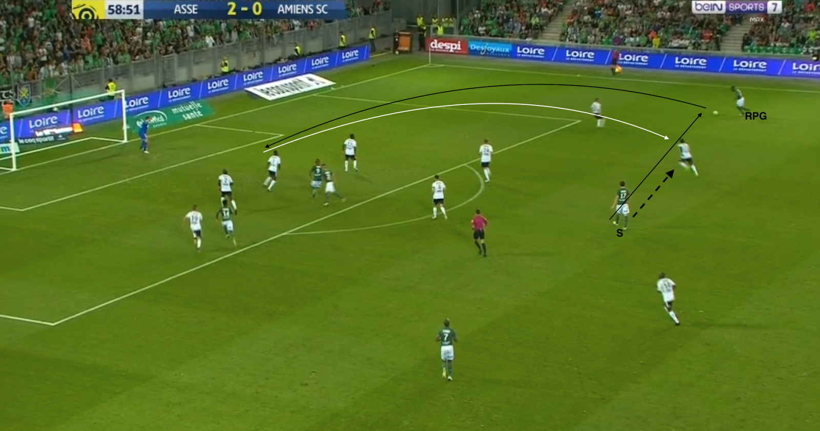 L'entrée de Maiga pour Diousse marque la fin des mauvais choix stéphanois dans la sortie de balle. Par contre, ce n'est pas directement lié au nouvel entrant, comme on peut le voir sur la toute première action après le changement :