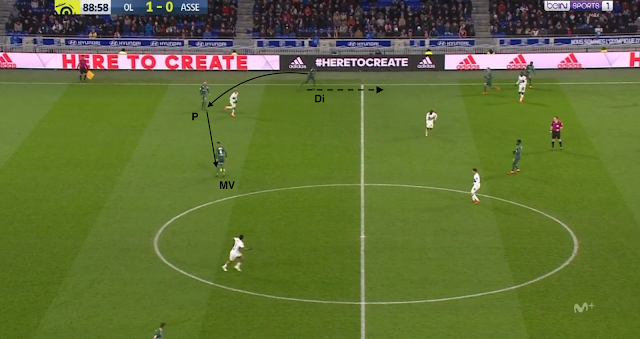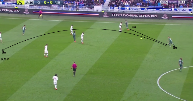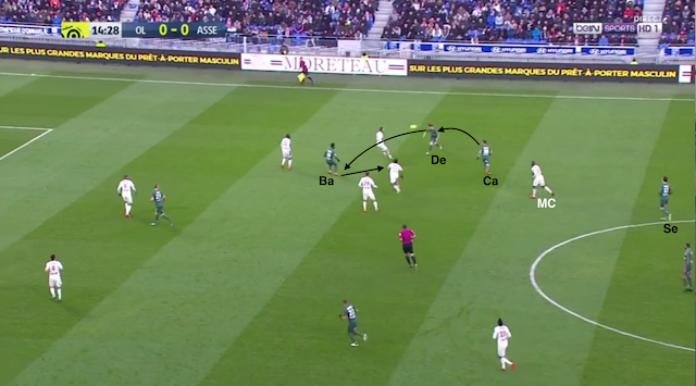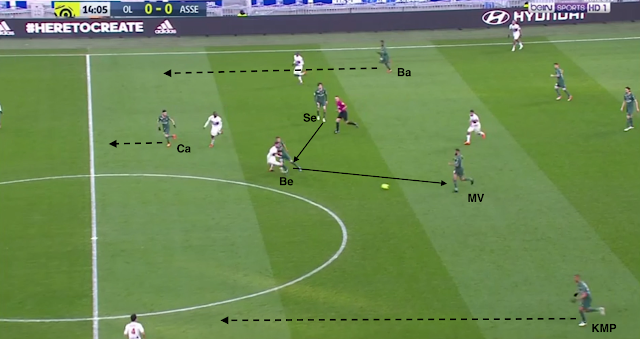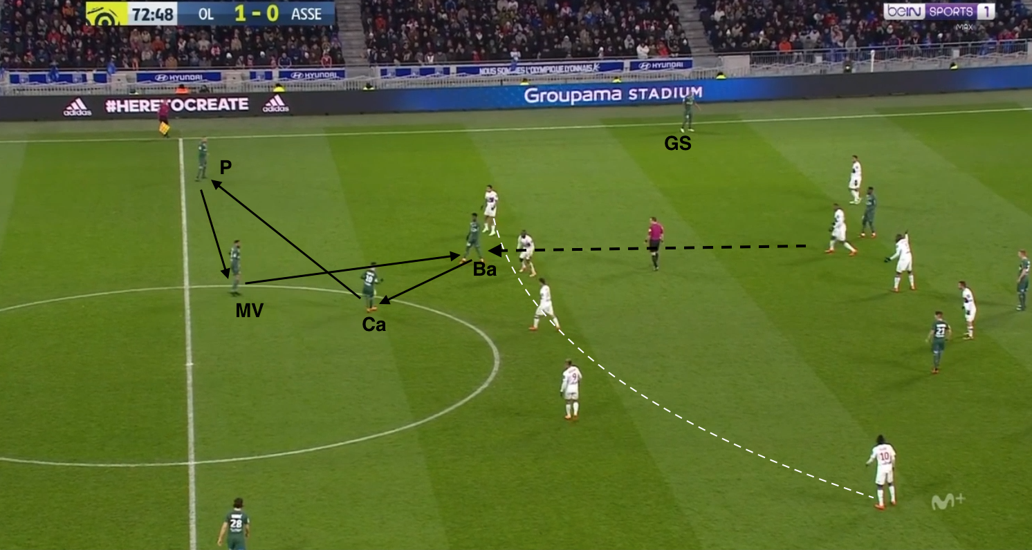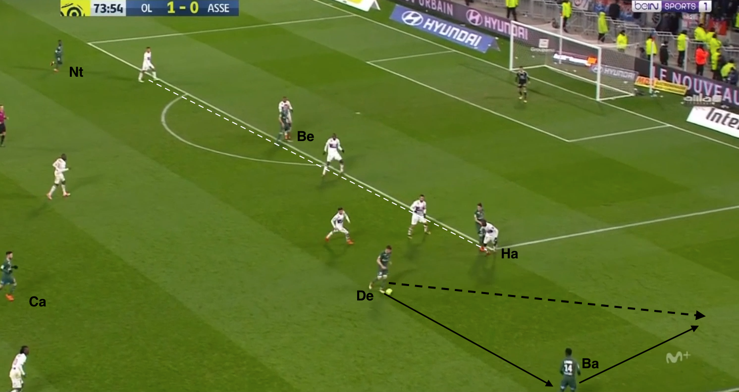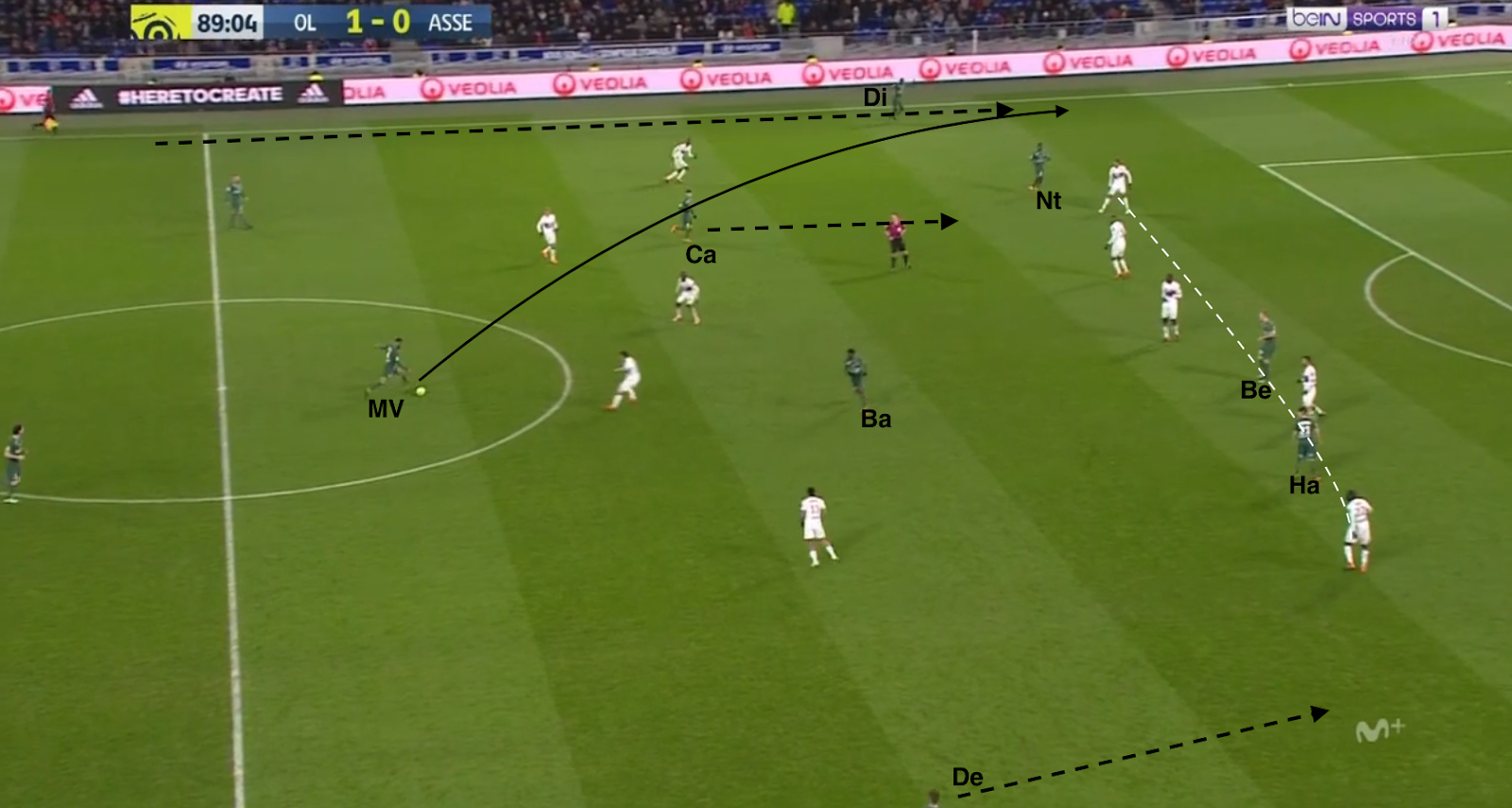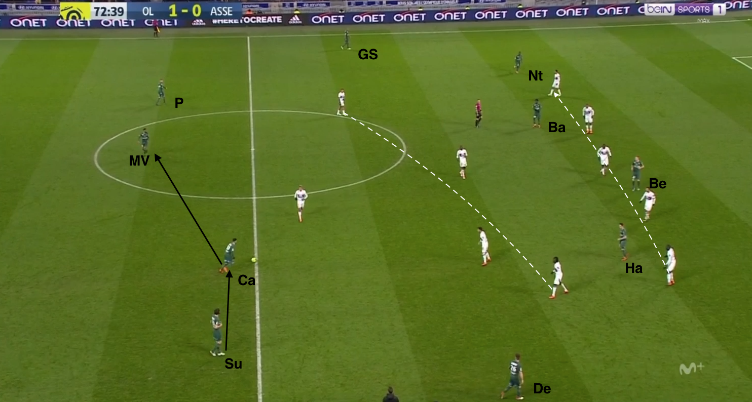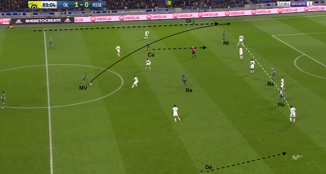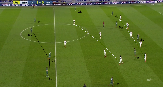 Les 5 défenseurs lyonnais sont alignés, 3 attaquants stéphanois s'y trouvent aussi, Bamba se place entre les lignes. Enfin, on peut difficilement parler de ligne des milieux adverses, ils ne sont pas bien placés, ils ne pressent pas et ils ne suivent pas non plus les appels en profondeurs des latéraux Verts. Sans être attaqué, M'Vila a donc tout le temps d'ajuster sa longue passe pour Diousse. Et au moment de la passe décisive de Cabella, il y a 6 Stéphanois dans la surface adverse...