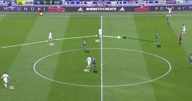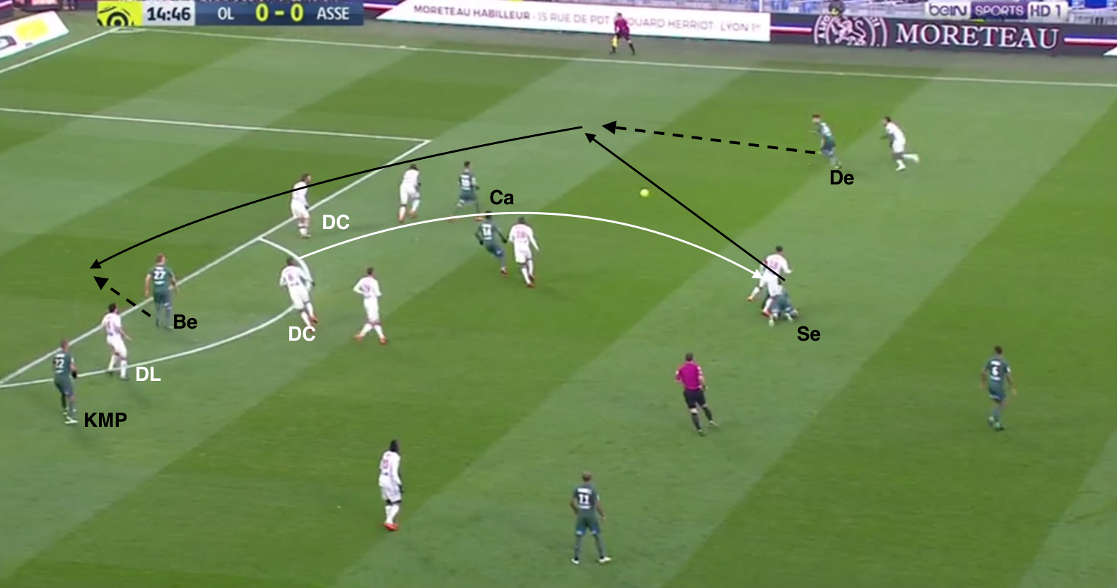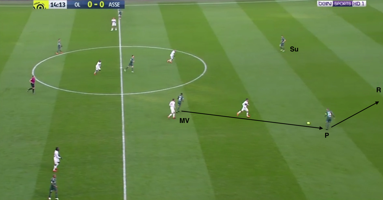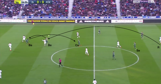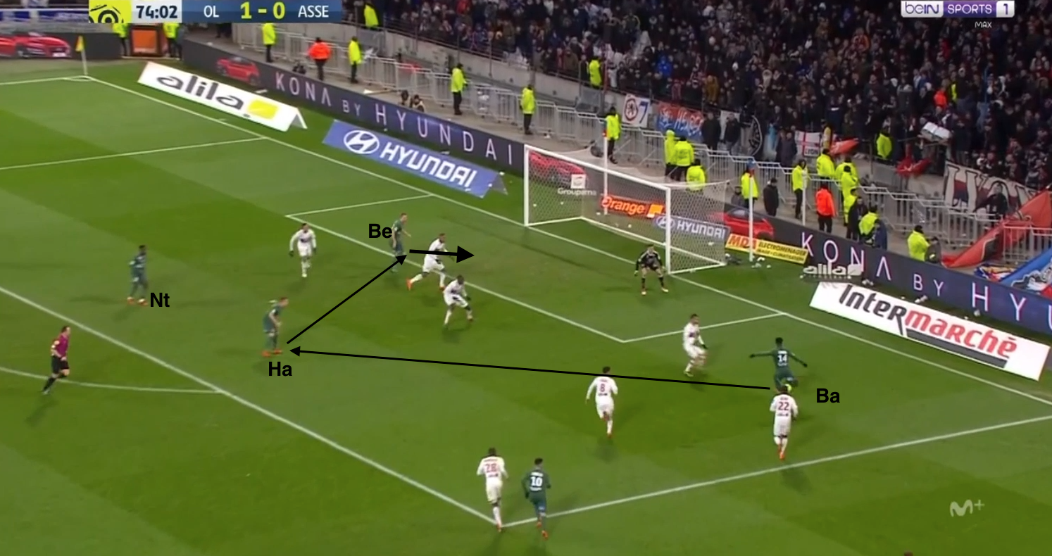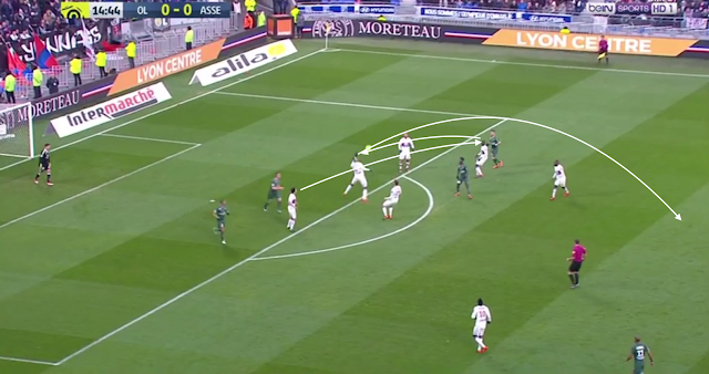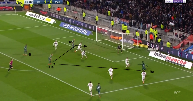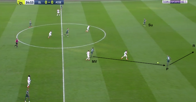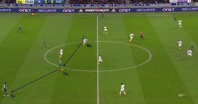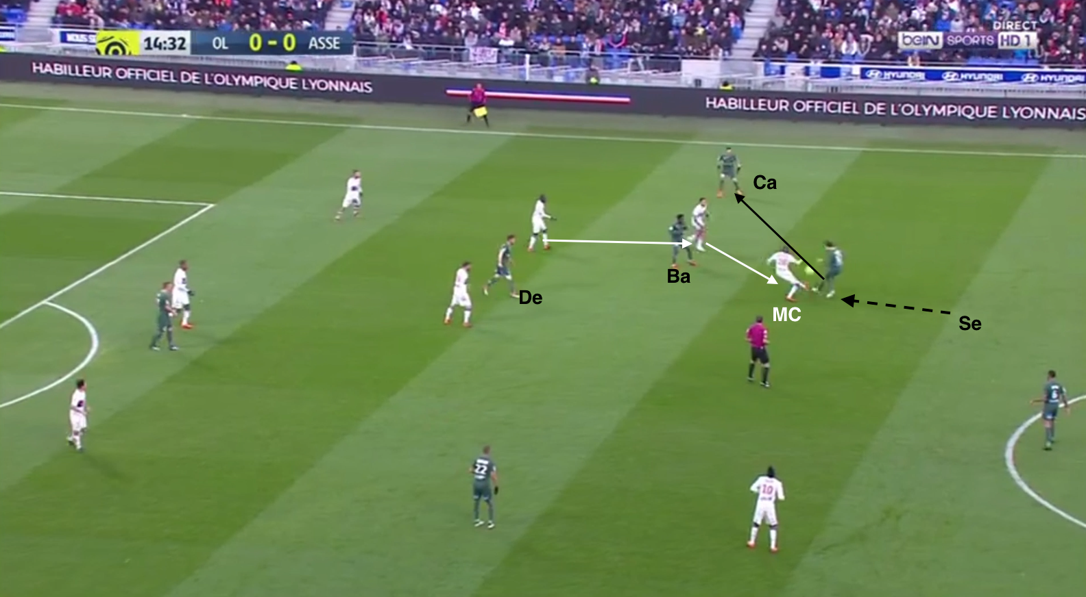 Les 5 défenseurs lyonnais sont alignés, 3 attaquants stéphanois s'y trouvent aussi, Bamba se place entre les lignes. Enfin, on peut difficilement parler de ligne des milieux adverses, ils ne sont pas bien placés, ils ne pressent pas et ils ne suivent pas non plus les appels en profondeurs des latéraux Verts. Sans être attaqué, M'Vila a donc tout le temps d'ajuster sa longue passe pour Diousse. Et au moment de la passe décisive de Cabella, il y a 6 Stéphanois dans la surface adverse...
