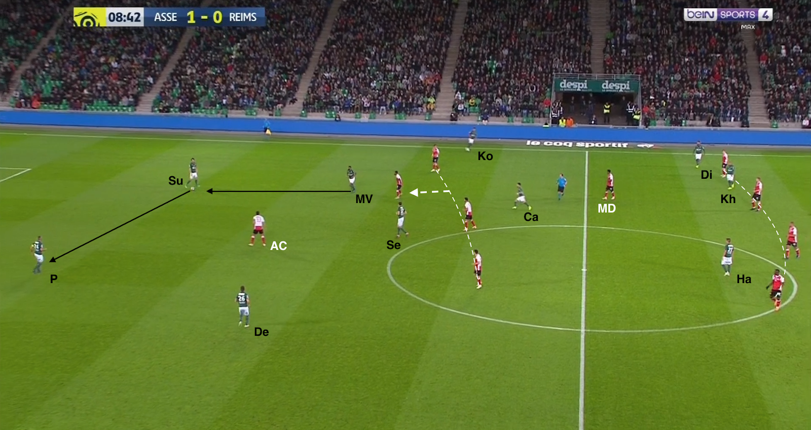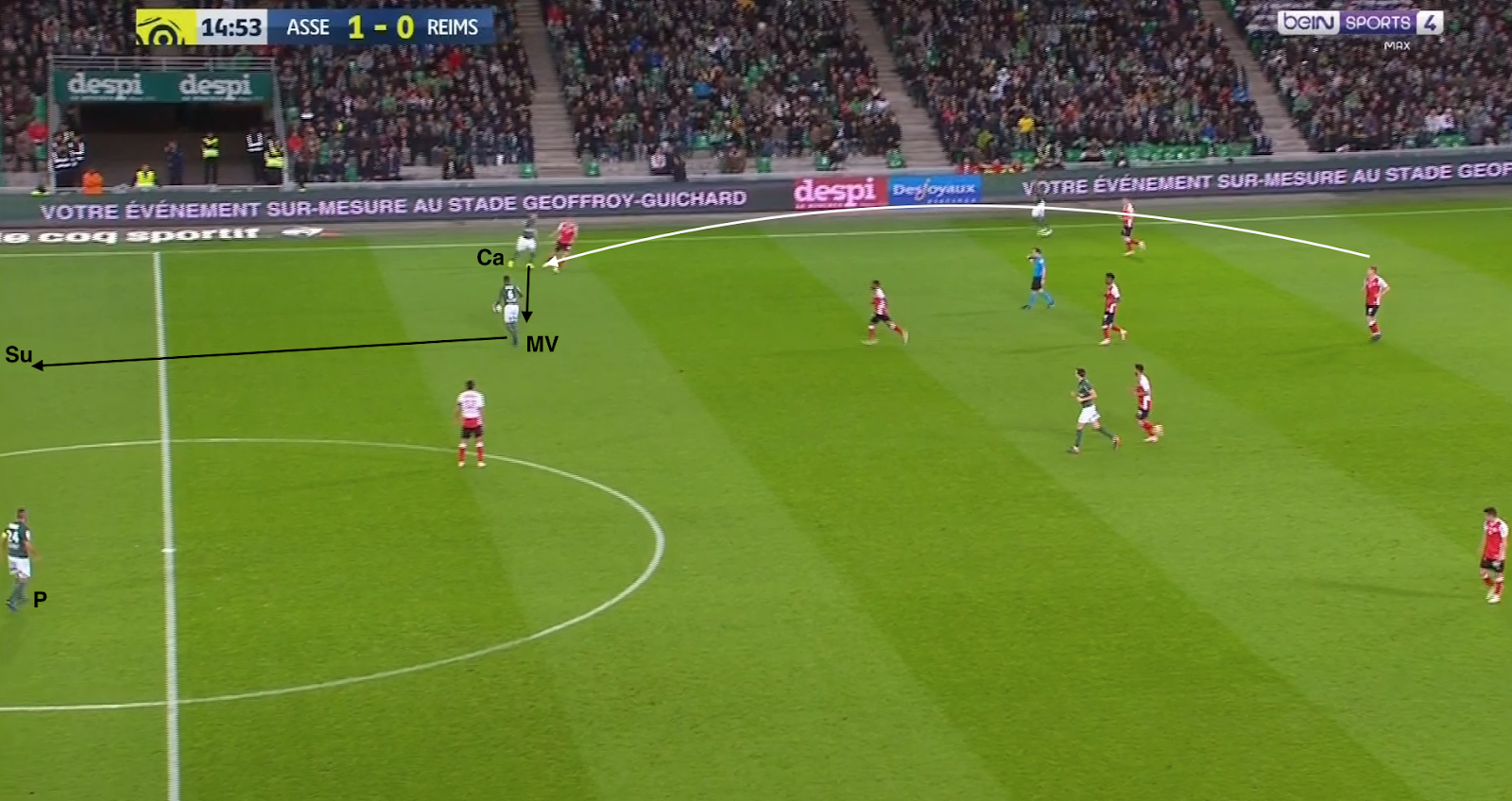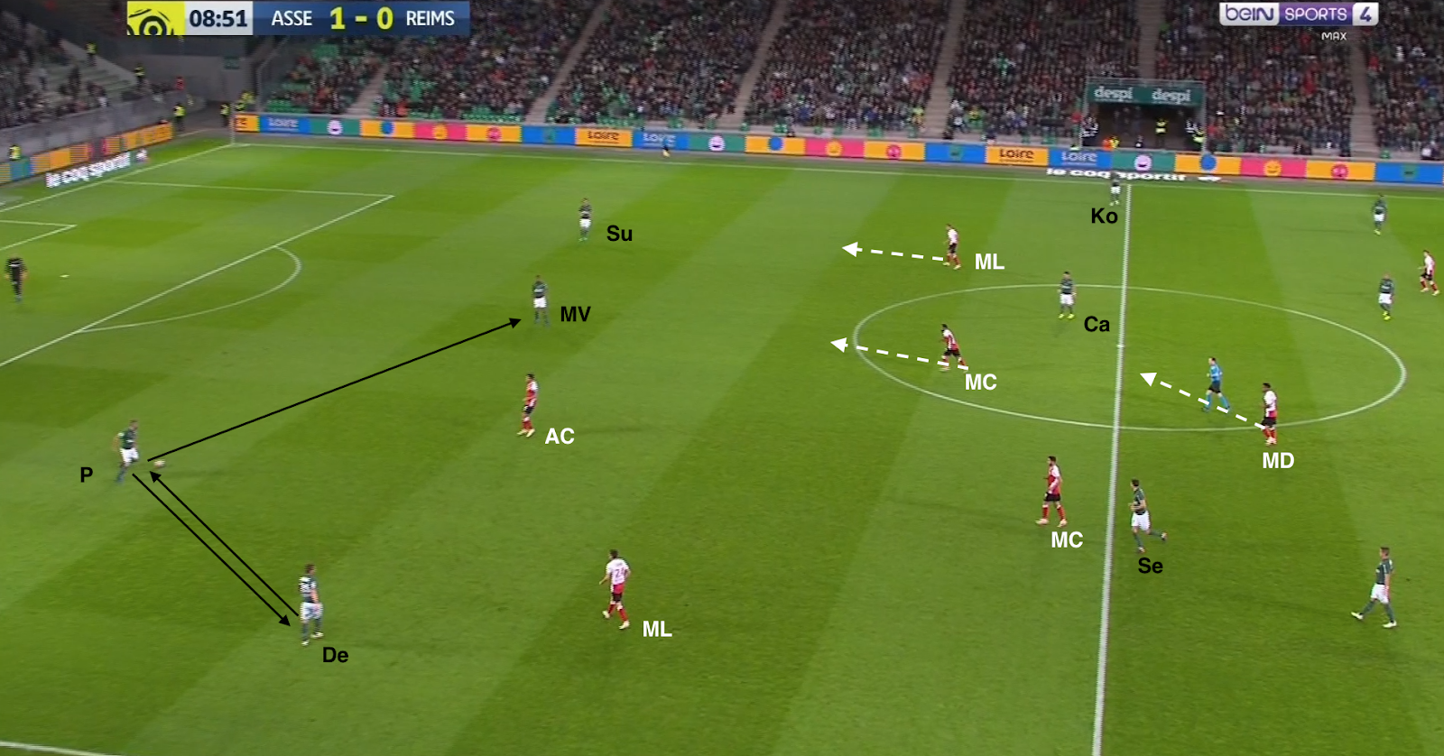Perrin reçoit de nouveau le ballon. L'angle de passe vers Debuchy est bouché par le milieu adverse et celui vers Subotic par l'avant-centre. M'Vila est surveillé par deux adversaires, pendant que Cabella est suivi par un autre. Mais Perrin lui fait confiance et lui donne le ballon - une feinte de passe vers Debuchy envoie le milieu axial rémois vers le côté et le numéro 7 stéphanois peut se retourner tranquille, les Verts se sortent du pressing :