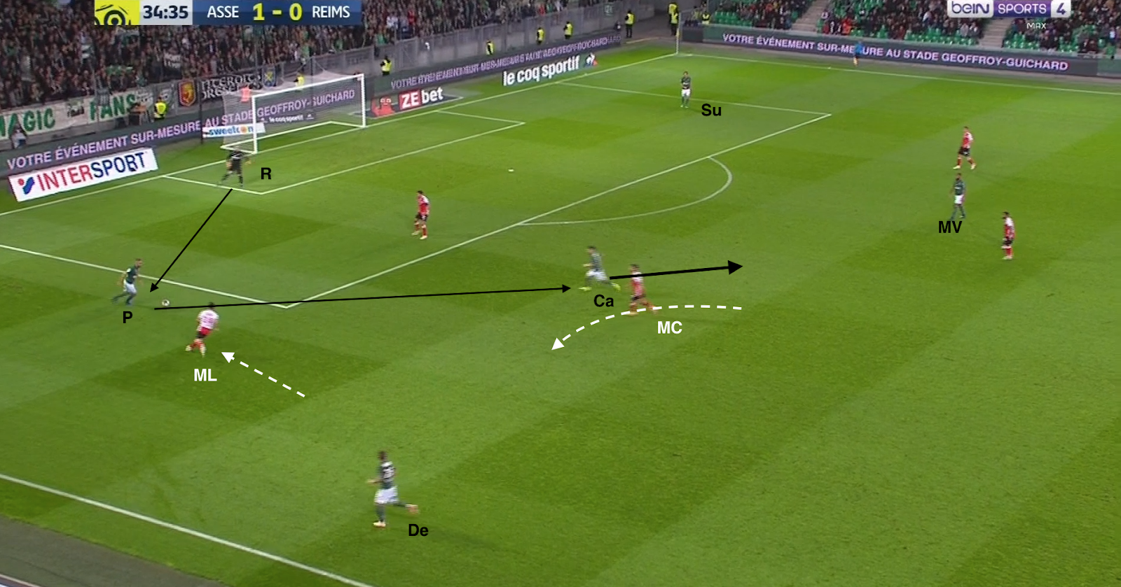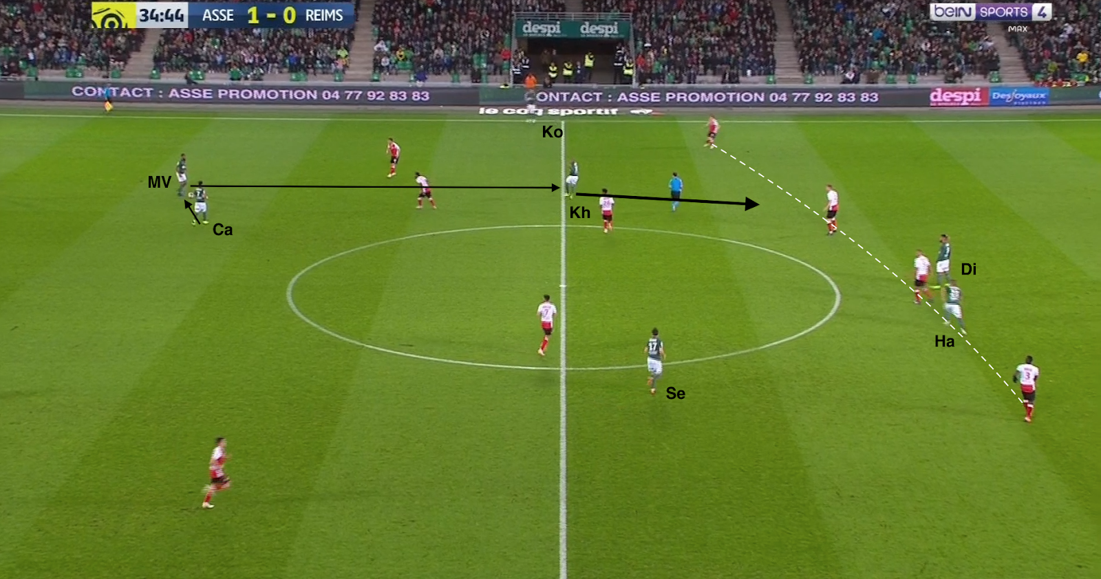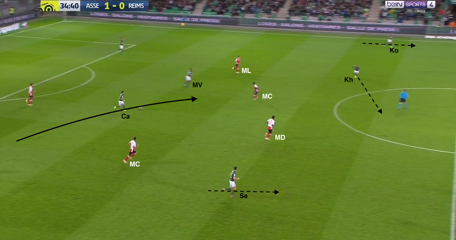 Perrin reçoit de nouveau le ballon. L'angle de passe vers Debuchy est bouché par le milieu adverse et celui vers Subotic par l'avant-centre. M'Vila est surveillé par deux adversaires, pendant que Cabella est suivi par un autre. Mais Perrin lui fait confiance et lui donne le ballon - une feinte de passe vers Debuchy envoie le milieu axial rémois vers le côté et le numéro 7 stéphanois peut se retourner tranquille, les Verts se sortent du pressing :
