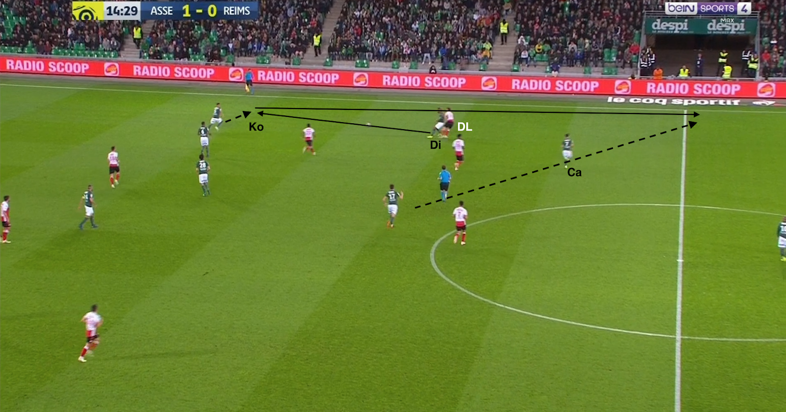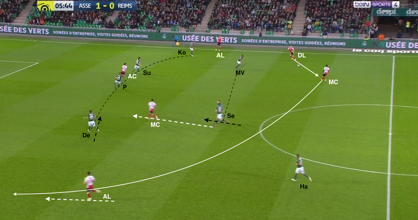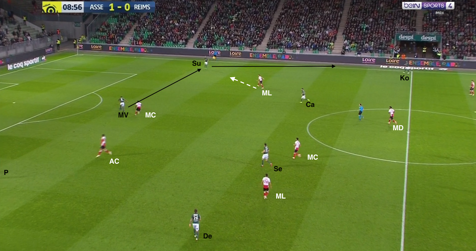La défense stéphanoise est en déséquilibre, le pressing a été déjoué et les 4 défenseurs et 2 milieux ne peuvent pas colmater toutes les brèches. Notamment à gauche, où M'Vila doit aider Kolo dans son couloir, mais aussi défendre contre un milieu axial :