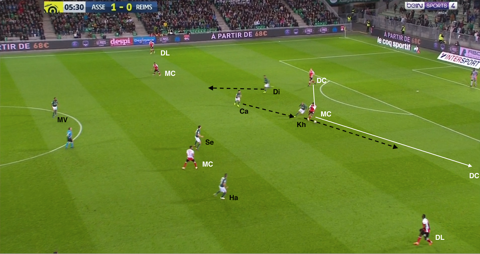 ... et si des nombreux joueurs sont concentrés dans cette zone du terrain, il y a plein de possibilités de l'autre côté, ou Diony se trouve seul entre trois adversaires. Comme le défenseurs de Reims se défait de Khazri, il a le temps de changer de côté proprement, via son gardien, qui lance le défenseur droit dans son couloir, dans le dos de Diony :