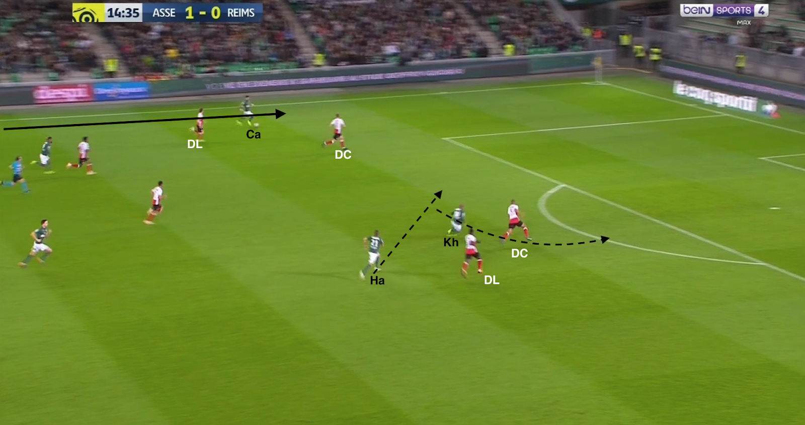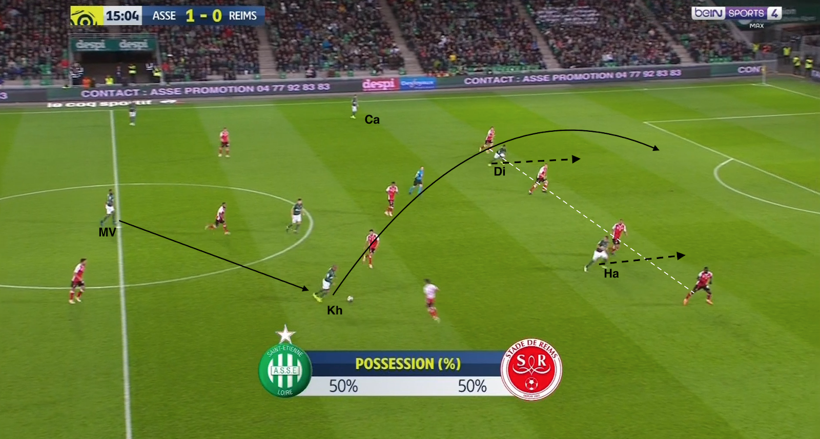 ... avant de le donner à M'Vila, qui trouve Khazri entre les lignes. Son contrôle orienté lui permet de se débarrasser de la sentinelle adverse et la défense de Reims est en difficulté : un latéral doit sortir sur Kolo, un central sur Khazri et deux autres doivent surveiller les appels de Diony et Hamouma dans l'axe. Finalement l'avant-centre stéphanois avance tout seul balle au pied et son tir de loin est capté par le gardien.