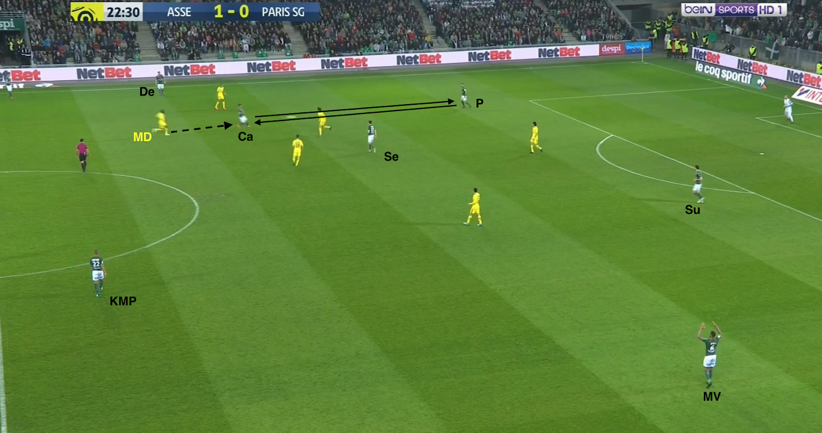Cabella, suivi toujours de près par la sentinelle adverse, décroche pour échanger des passes avec son capitaine. Ça a le don d'attirer les Parisiens, qui se retrouvent à 6 dans les 30 mètres stéphanois (laissant donc les 4 défenseurs sur la ligne médiane), en train de presser. Et comme dans l'exemple précédent, M'Vila se retrouve en latéral gauche, tout seul, faisant des grands gestes pour avoir le ballon pendant quelques secondes. KMP est complètement libre dans l'axe et Gabriel Silva - pas sur l'image - apporte un surnombre encore plus important dans ce grand espace à gauche.
