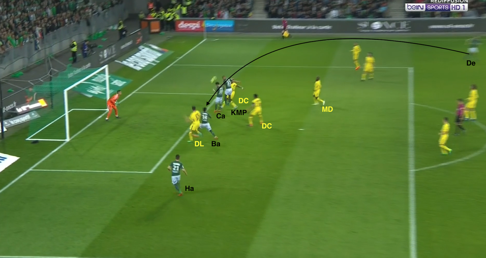 Les Stéphanois étaient bien en place, les 8 éléments défensifs (4 défenseurs et 4 milieux) se trouvent dans leur surface, laissant seulement Bamba et Cabella en attaque. C'est le premier qui récupère le dégagement...