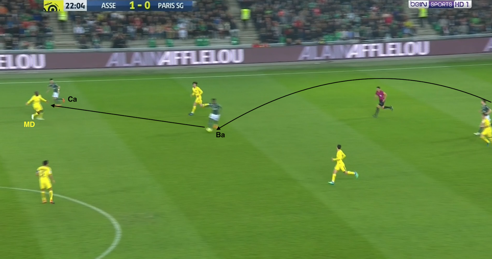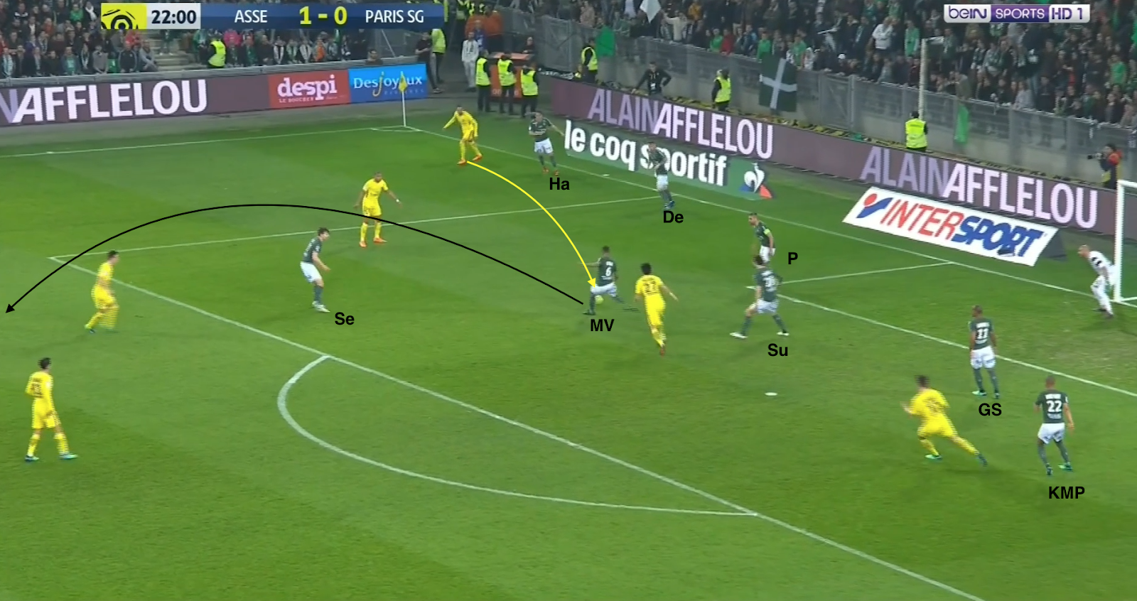 Les 5 Parisiens (tous sauf les 4 défenseurs) essayent d'enfermer les Stéphanois, pendant que M'Vila, complètement seul sur son côté gauche, fait des grands gestes pour demander le ballon. Il le reçoit via Selnaes, servi par Ruffier malgré le pressing adverse, et le donne ensuite à Cabella. Les Verts ont un grand espace à leur disposition et ils en profitent :
