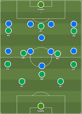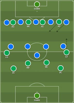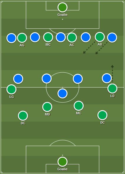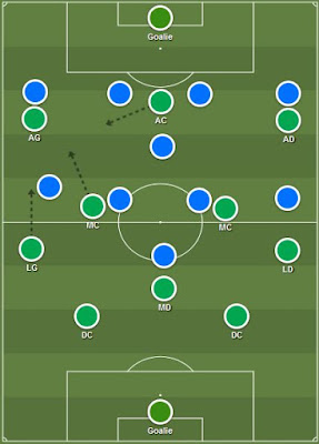 Le milieu central et l'avant-centre se projettent ainsi vers un côté et avec les deux joueurs présents (le défenseur latéral et l'ailier), la densité des joueurs est assez importante. On arrive donc à un jeu de passes courtes, dans un petit périmètre, ce qui n'est pas donné à tout le monde. Voici une capture d'écran des Verts qui essaient ce type d'attaque :