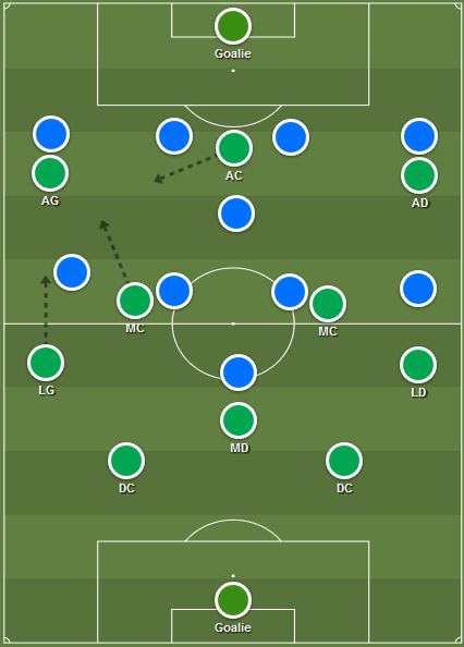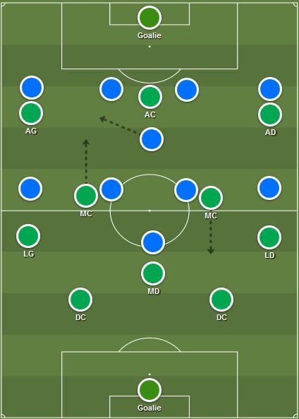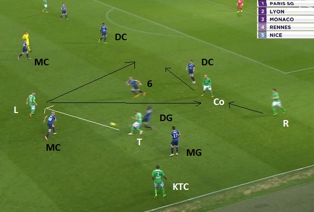 S'il existe plein de variations à cette tactique, analysons-en une qui a été souvent utilisée par les Verts contre Troyes. Comme les deux milieux centraux (Cohade et Lemoine dans ce cas) ne peuvent pas être facilement trouvés dans le bloc troyen, ils bougent. L'un (souvent Cohade) monte très haut, au niveau des attaquants, pendant que l'autre descend au niveau de la sentinelle :