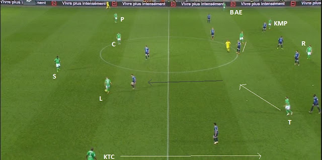 Dans un autre exemple à la 28e minute, on voit bien Cohade sur la même ligne que Roux - il occupe ainsi le défenseur droit adverse, laissant beaucoup d'espace à BAE et KMP :