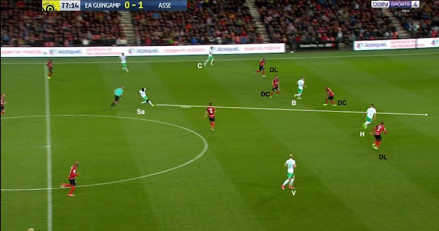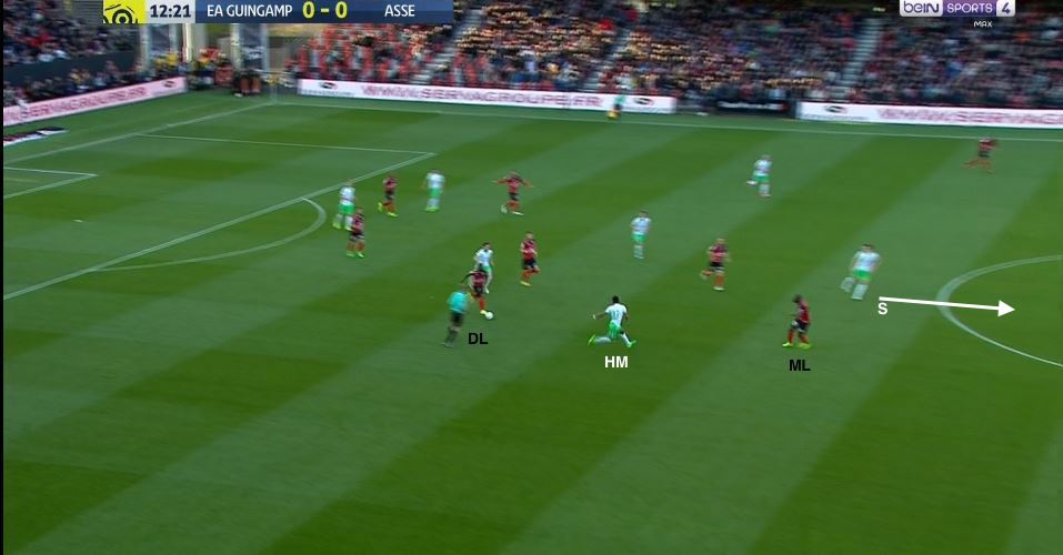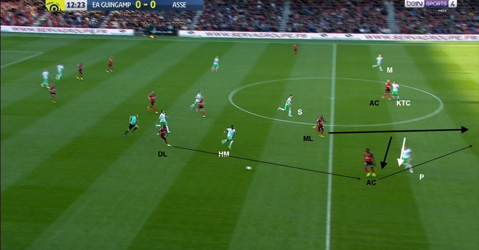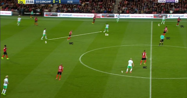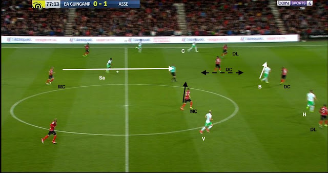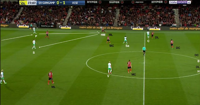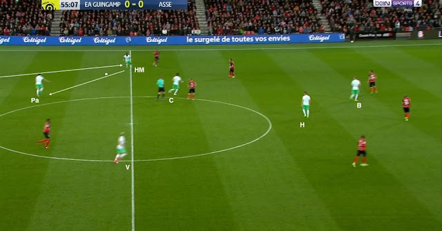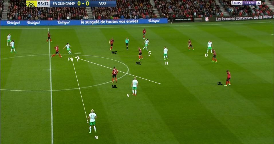 Comme le changement tactique de la semaine dernière contre Rennes a été prometteur, même sans victoire au bout, le staff stéphanois a suivi la même approche tactique contre Guingamp. C'est-à-dire, un 4-3-3 avec un triangle à pointe basse (Selnaes) au milieu, deux ailiers (Hamouma et Corgnet) qui attaquaient seulement dans l'axe, laissant les couloirs pour des latéraux très offensifs (Maiga et Malcuit). Mais il y avait quand-même quelques différences par rapport au match de la semaine dernière, qu'on illustrera avec quelques exemples.
