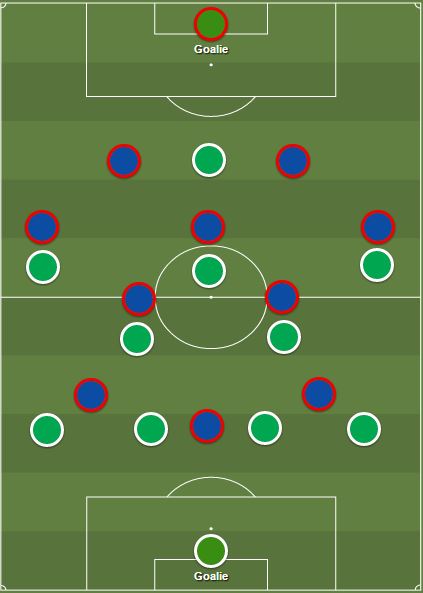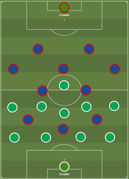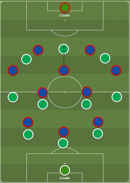 Lors de la troisième confrontation, en championnat, la première dans le Chaudron, les Verts ont proposé un 3-4-3 assez inhabituel. Le but ? Prendre les Parisiens en un contre un partout sur le terrain (3 défenseurs centraux vu que leurs ailiers entrent souvent), forçant ainsi la sentinelle adverse à reculer pour aider ses défenseurs, cassant donc le bloc parisien :