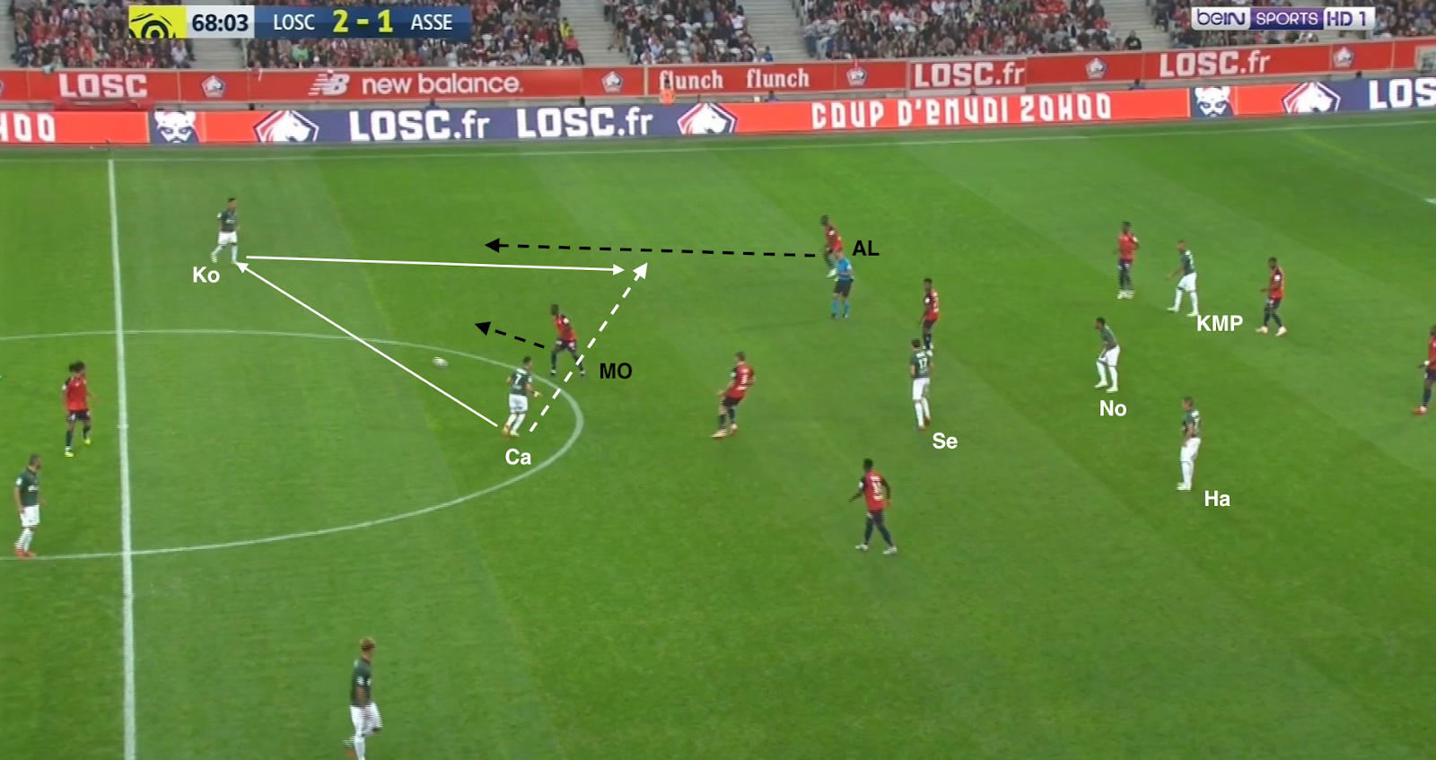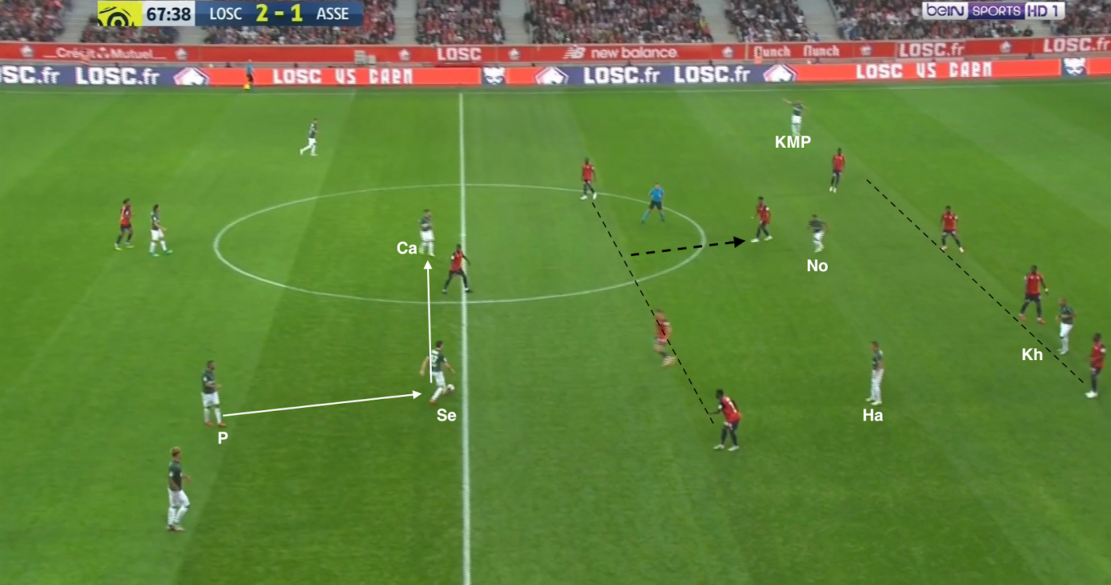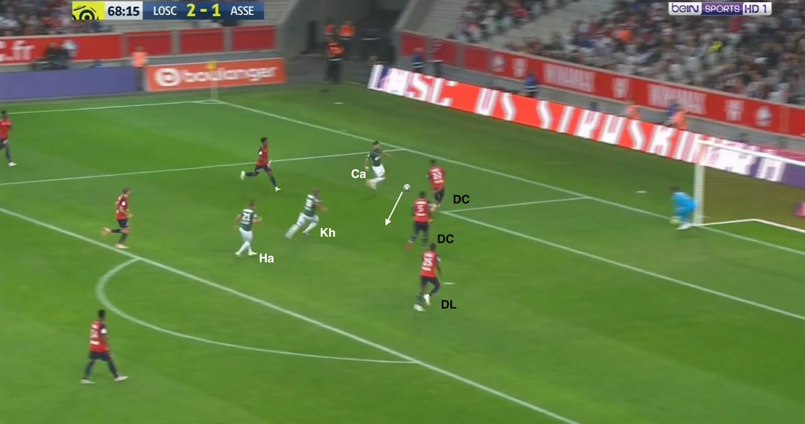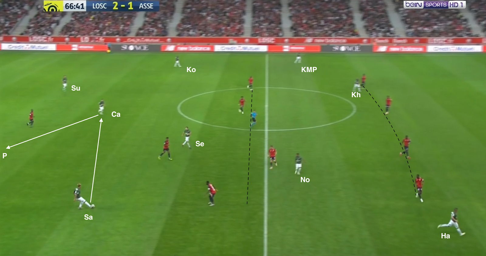 Toujours un 4-2-3-1 pour l'ASSE et de l'espace entre les deux lignes du LOSC - un milieu descend même de sa ligne pour être au marquage du "10" stéphanois, Perrin, Selnaes et Cabella combinent et le dernier joue avec Saliba à droite :