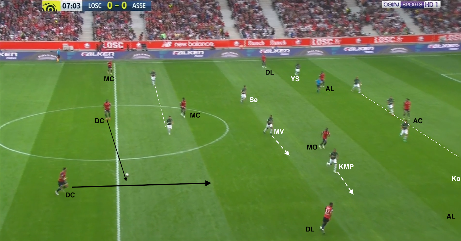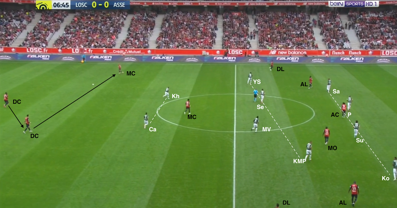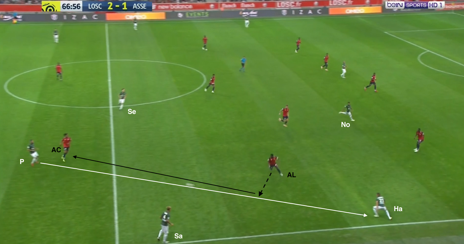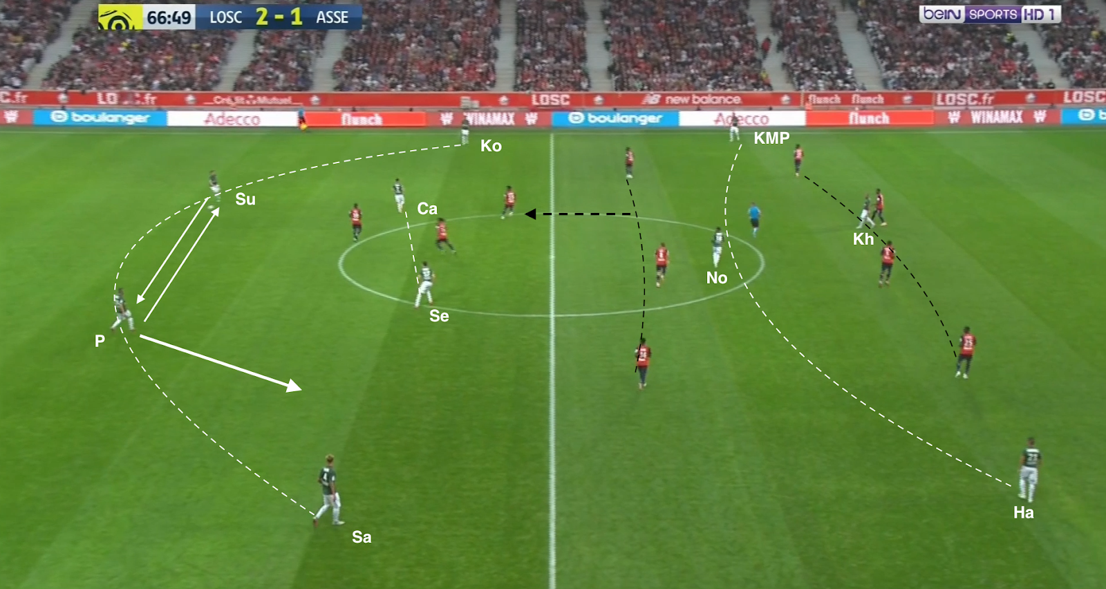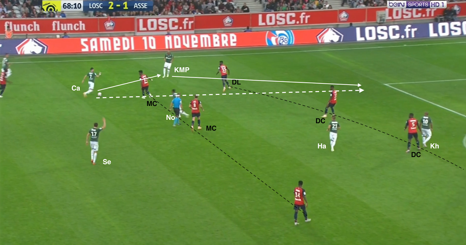 Toujours un 4-2-3-1 pour l'ASSE et de l'espace entre les deux lignes du LOSC - un milieu descend même de sa ligne pour être au marquage du "10" stéphanois, Perrin, Selnaes et Cabella combinent et le dernier joue avec Saliba à droite :