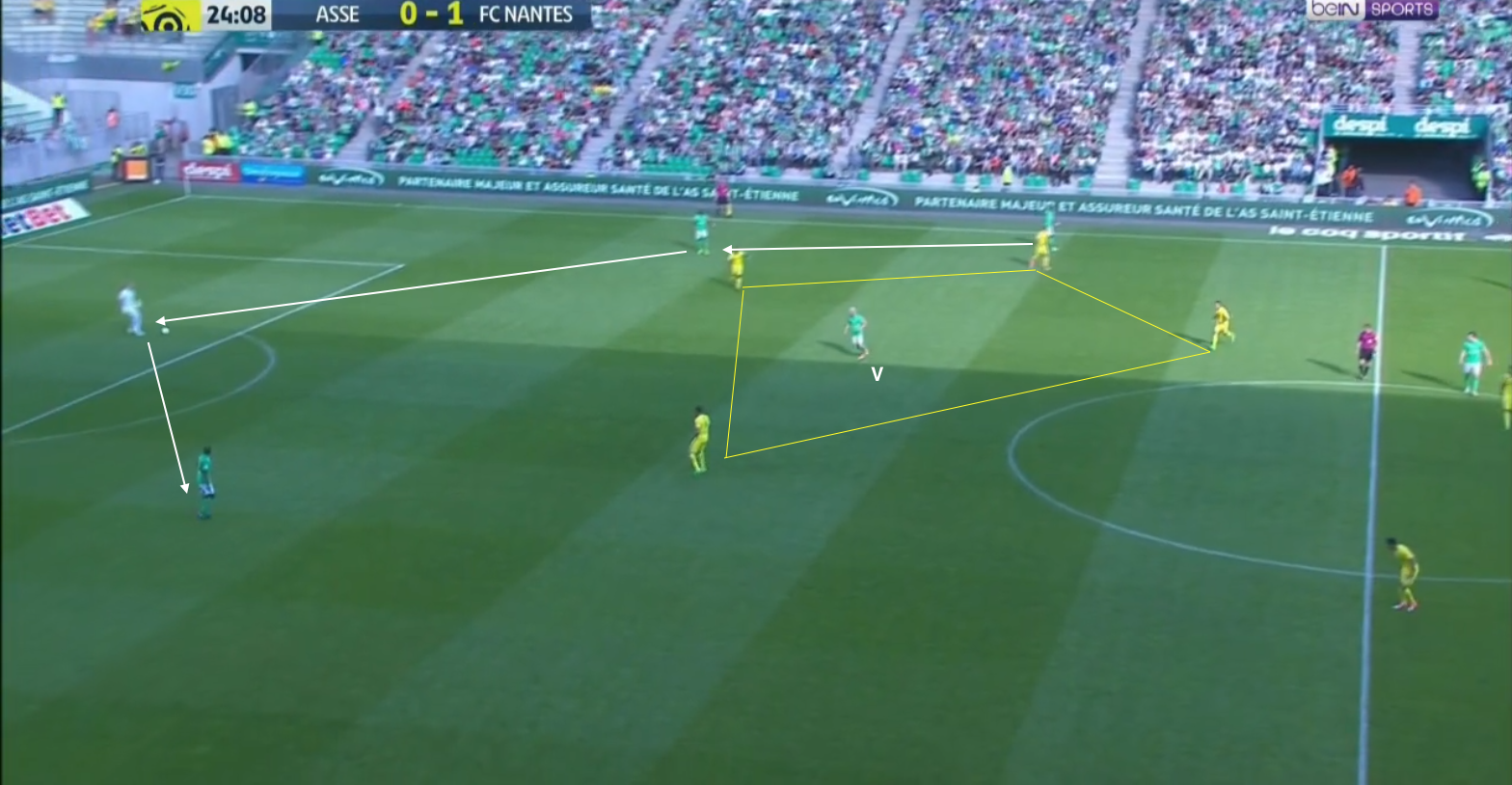 Il y a plusieurs choses à remarquer sur cette capture d'écran. Nantes joue avec deux avant-centres qui font des appels complémentaires, un en profondeur, un entre les lignes. Les deux milieux excentrés sont très axiaux, serrant au maximum notre bloc. Sur cette image ils sont entre les lignes, sur d'autres actions ils sont sur la ligne des défenseurs, mais quasiment tout le temps, à l'intérieur de nos latéraux - c'est comme ça que le but nantais a été créé d'ailleurs. Bloc serré, déplacements sans ballons, le tout pour un but : libérer les couloirs pour les latéraux. Si celui suivi par KMP n'a pas encore démarré sa course, celui de Hamouma a démarré son sprint avant que le ballon arrive au milieu latéral qui va le servir - cette action a été clairement travaillée avant le match.