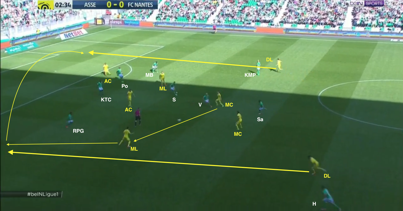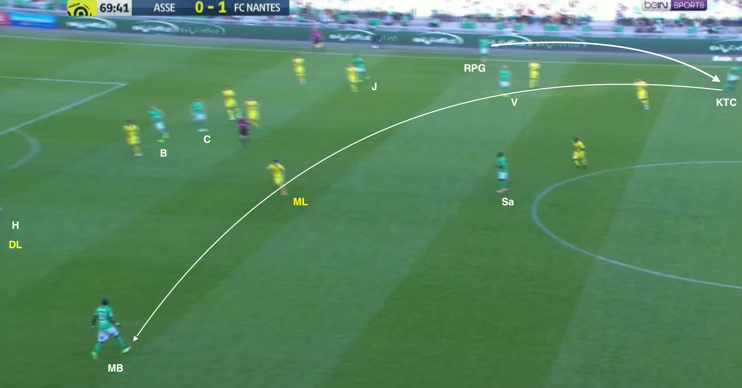 Pour l'exemple, on n'utilisera pas une attaque stéphanoise, mais une nantaise. Ça ne veut pas dire que nos latéraux ne sont pas montés dans le camp adverse - ils l'ont fait, parfois apportant un réel danger. Ça a été le cas plus de Pierre-Gabriel en 1MT et plus de MBengue en 2MT - ce partage de période vient moins de la fatigue que du style de jeu de l'ailier partenaire. Hamouma est un ailier qui est très attiré par l'axe, laissant le couloir pour le latéral, pendant que KMP et surtout Jorginho sont plus collés à la ligne de touche. Et comme après l'entrée du dernier, Hamouma a joué tout le temps à gauche, il n'est pas surprenant de voir MBengue plus offensif que Pierre-Gabriel à ce moment là.