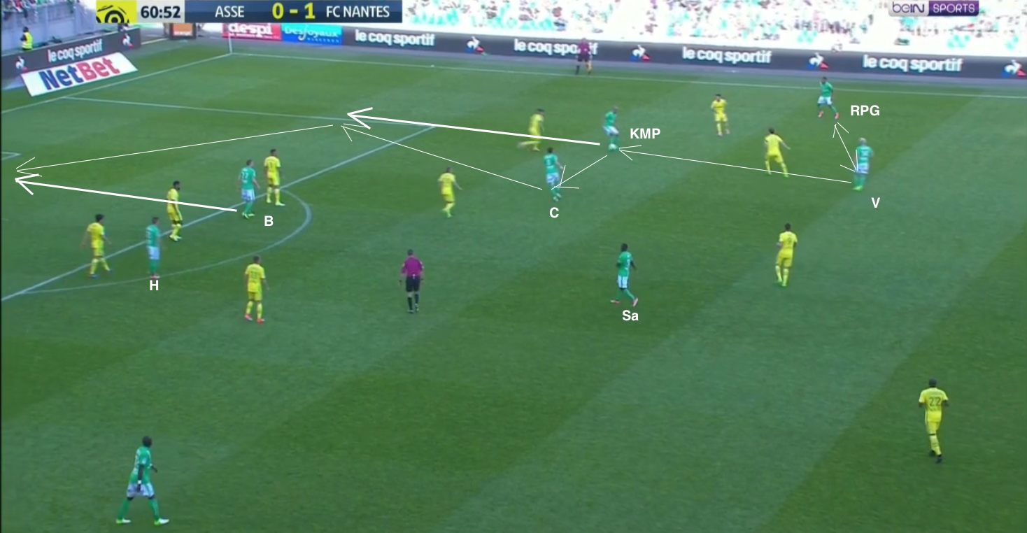 Un exemple est la plus collective attaque stéphanoise de tout le match, à la 61ème, quand KMP était encore sur le terrain. Hamouma est dépossédé du ballon à la hauteur de la ligne médiane...