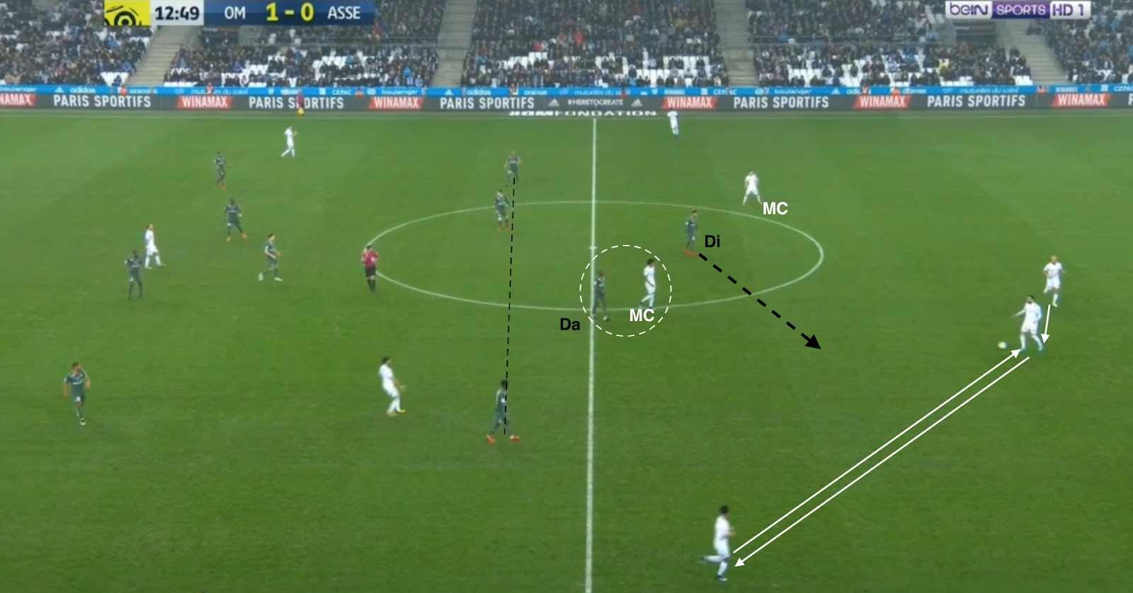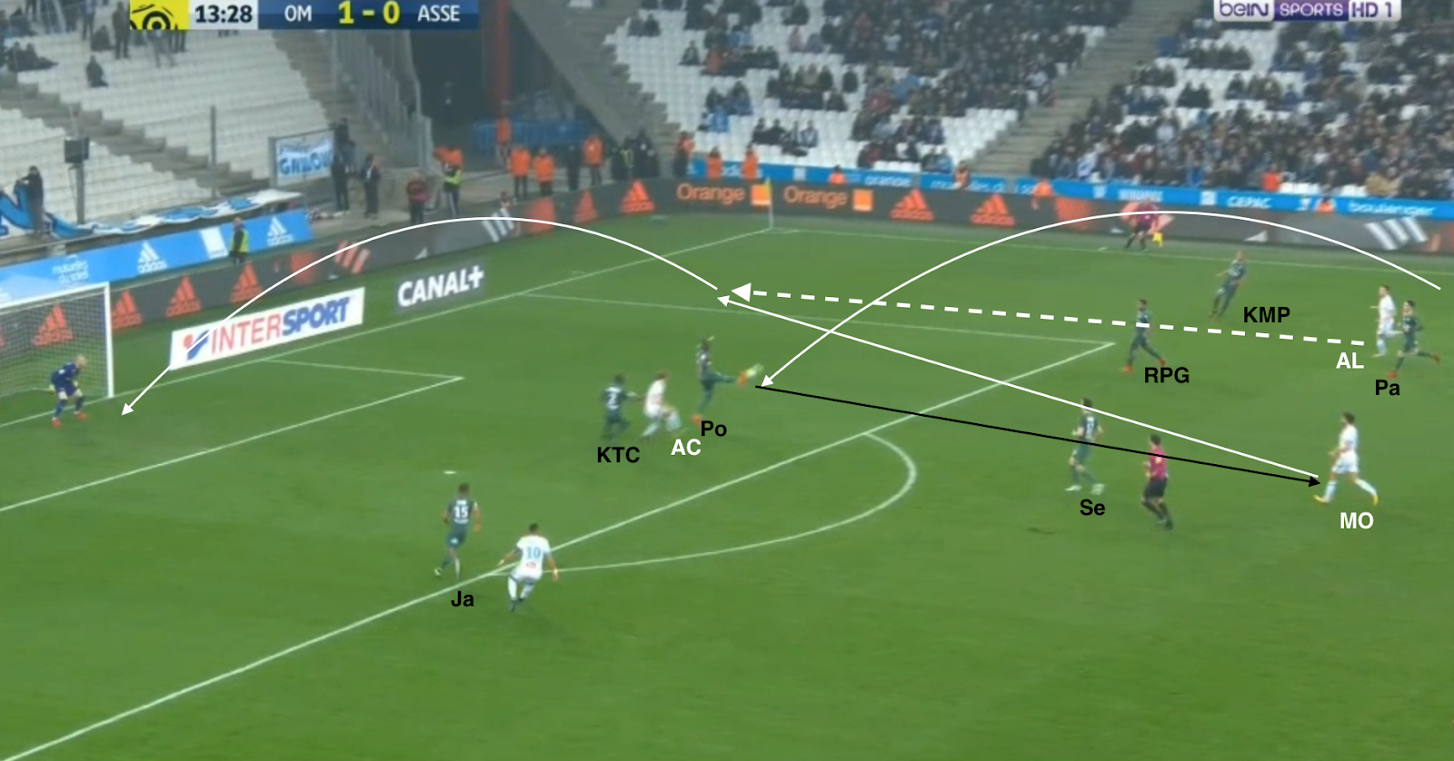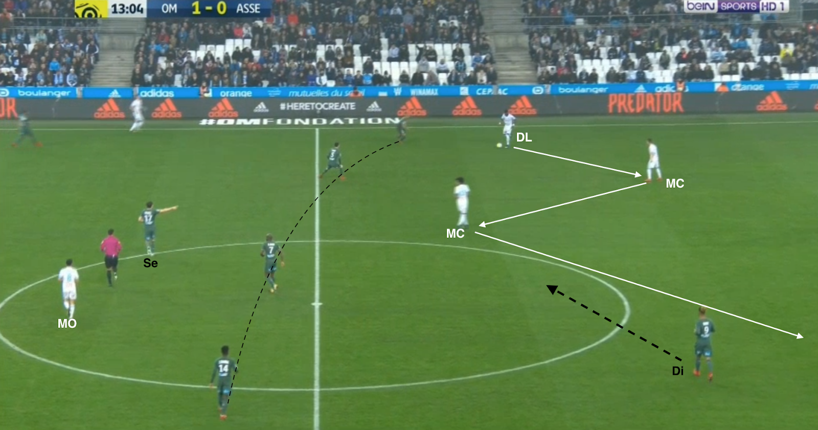 Les deux systèmes de jeu (4-1-4-1 vs 4-2-3-1) sont très explicites sur cette image - on peut aussi voir Dabo bien replié, sans faire de marquage individuel comme avant, et Diony qui ne peut pas couper les circuits de passe. Et l'attaque que l'OM a préparé tranquillement dans sa moitié est enfin déclenchée :