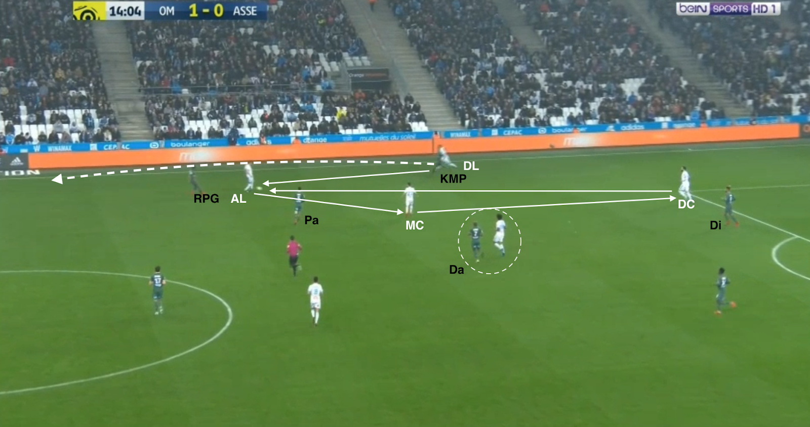 KMP sur le latéral, RPG sur l'ailier, Dabo sur le même axial qu'avant, Pajot et Selnaes pas loin des autres milieux, Diony et Bamba coupant les possibilités de sortie de ce coin du terrain. Chose que les Marseillais n'essayent même pas : le latéral s'appuie sur l'ailier avant de faire un appel, le ballon circule entre l'ailier, le milieu et le défenseur central. Ce jeu dans un petit périmètre est risqué...