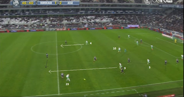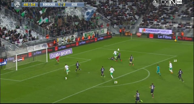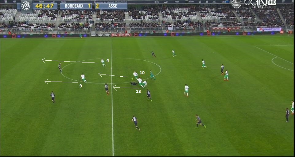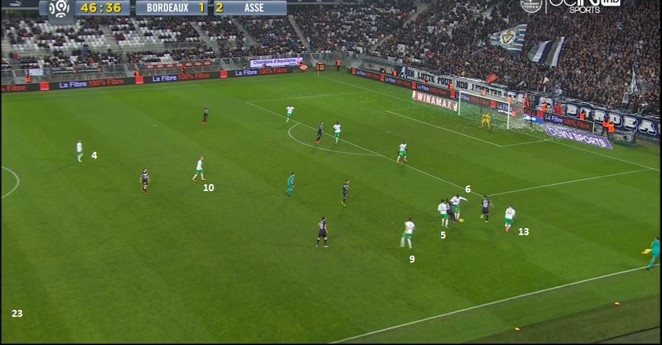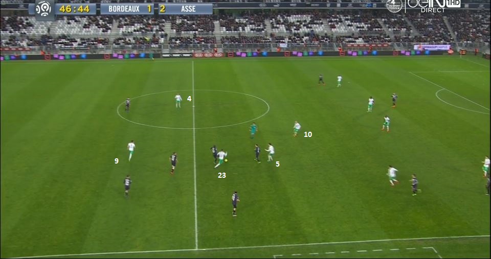 Ce pressing porte ces fruits, le ballon est récupéré par les Verts et arrive dans les pieds de Cohade (10). Les deux ailiers sont toujours dans une bonne position suite à leur premier appel, pendant que les défenseurs stéphanois se retrouvent à 35m de leur but maintenant :