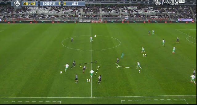 La remise de Söderlund est pour la course de Roux, malheureusement le défenseur girondin avait bien lu le jeu et intercepte. Ça ne sera que partie remise, mais néanmoins le bloc stéphanois a bien pu remonter pendant que Söderlund gardait le ballon (3 secondes).