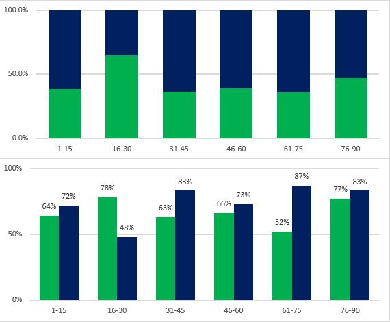 Pour mieux illustrer l'évolution du match, les deux graphiques ci-dessous montrent par tranche de 15 minutes la possession du ballon (Bordeaux vs ASSE) et le pourcentage des passes réussies par les deux équipes: