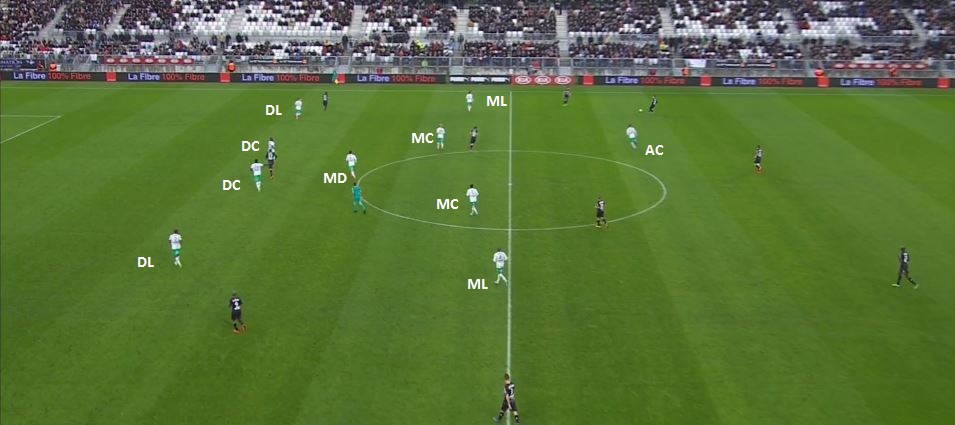 Sur cette capture d'écran on voit bien le bloc stéphanois, ainsi que Clément qui est positionné entre les deux lignes, même s'il n'a pas d'adversaire à cet endroit là.