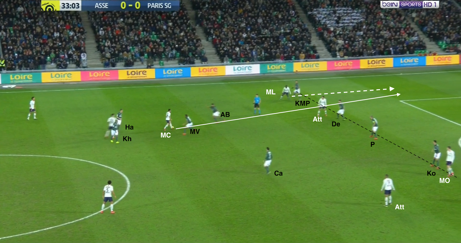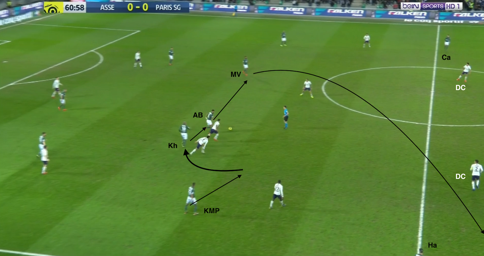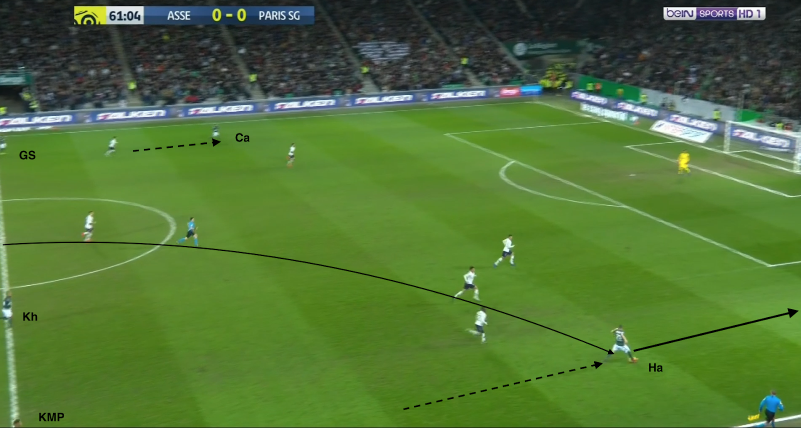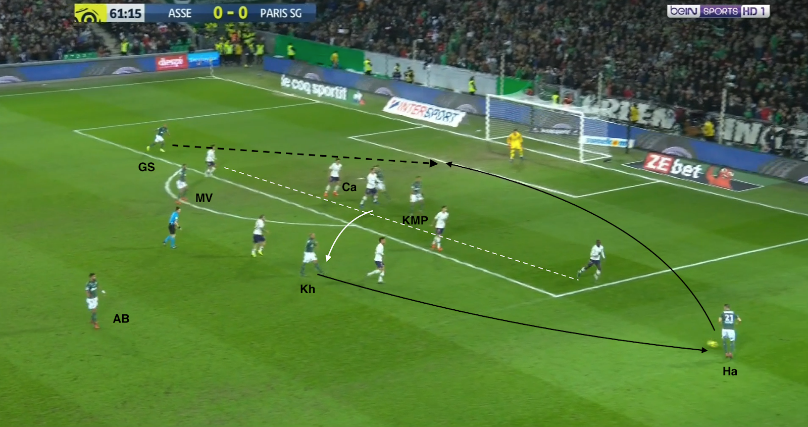 Le choix stéphanois a clairement été de défendre bas, avec un bloc très compact, dense dans l'axe. Même si un 0-0 aurait satisfait les Verts, ils ont aussi envisagé de se montrer dangereux en contre, comme dans cet exemple qui commence à la 61e avec une attaque parisienne :