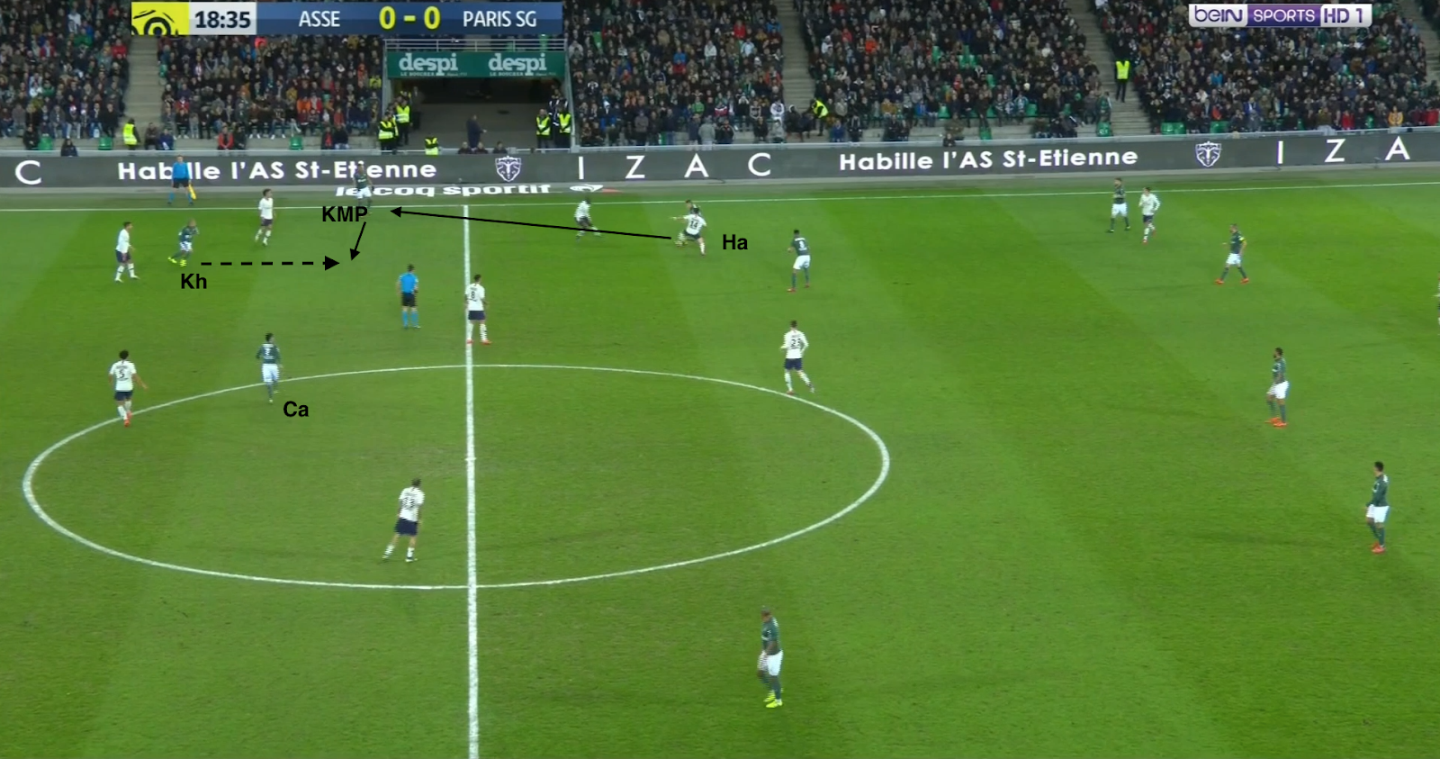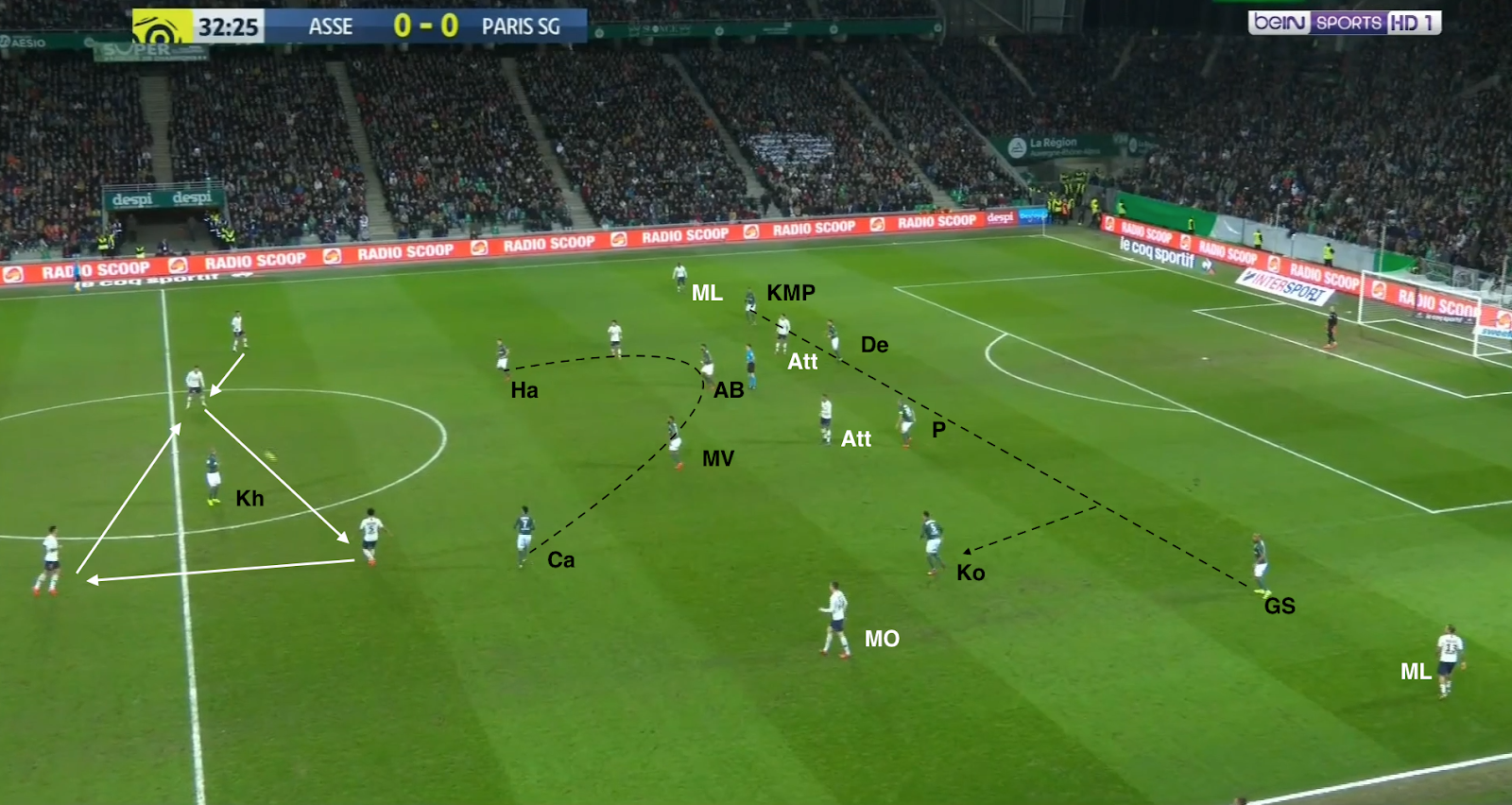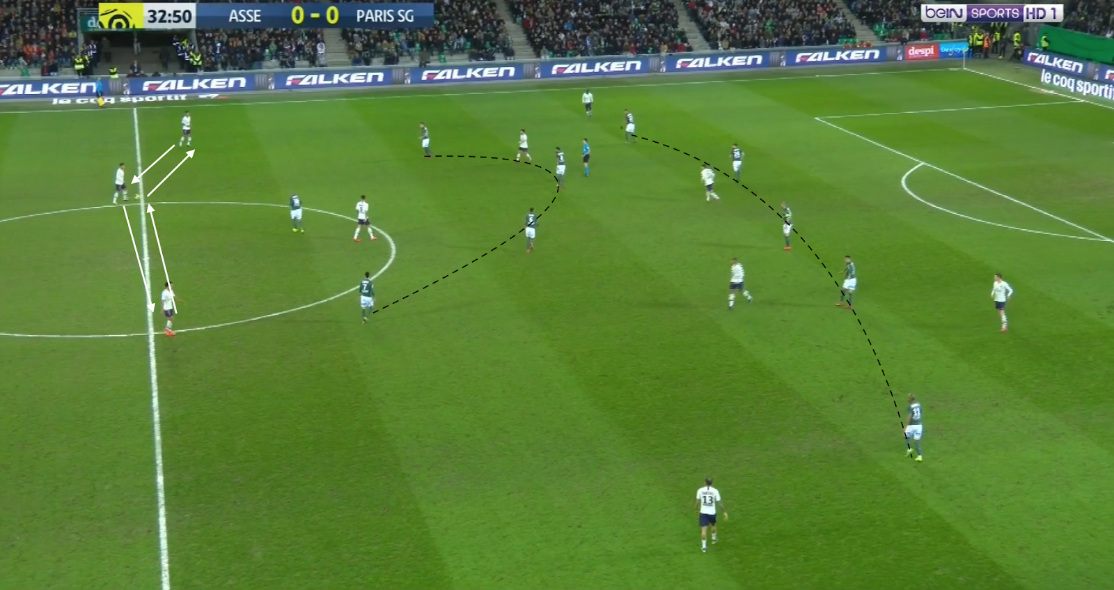 ... et on aperçoit une équipe du PSG coupée en deux. Quatre font un toro avec Khazri dans le rond central, cinq sont pris par les cinq défenseurs de l'ASSE et celui qui devrait relayer le ballon entre eux est pris entre les milieux stéphanois. Les défenseurs parisiens décident d'amener du surnombre en montant plus haut :