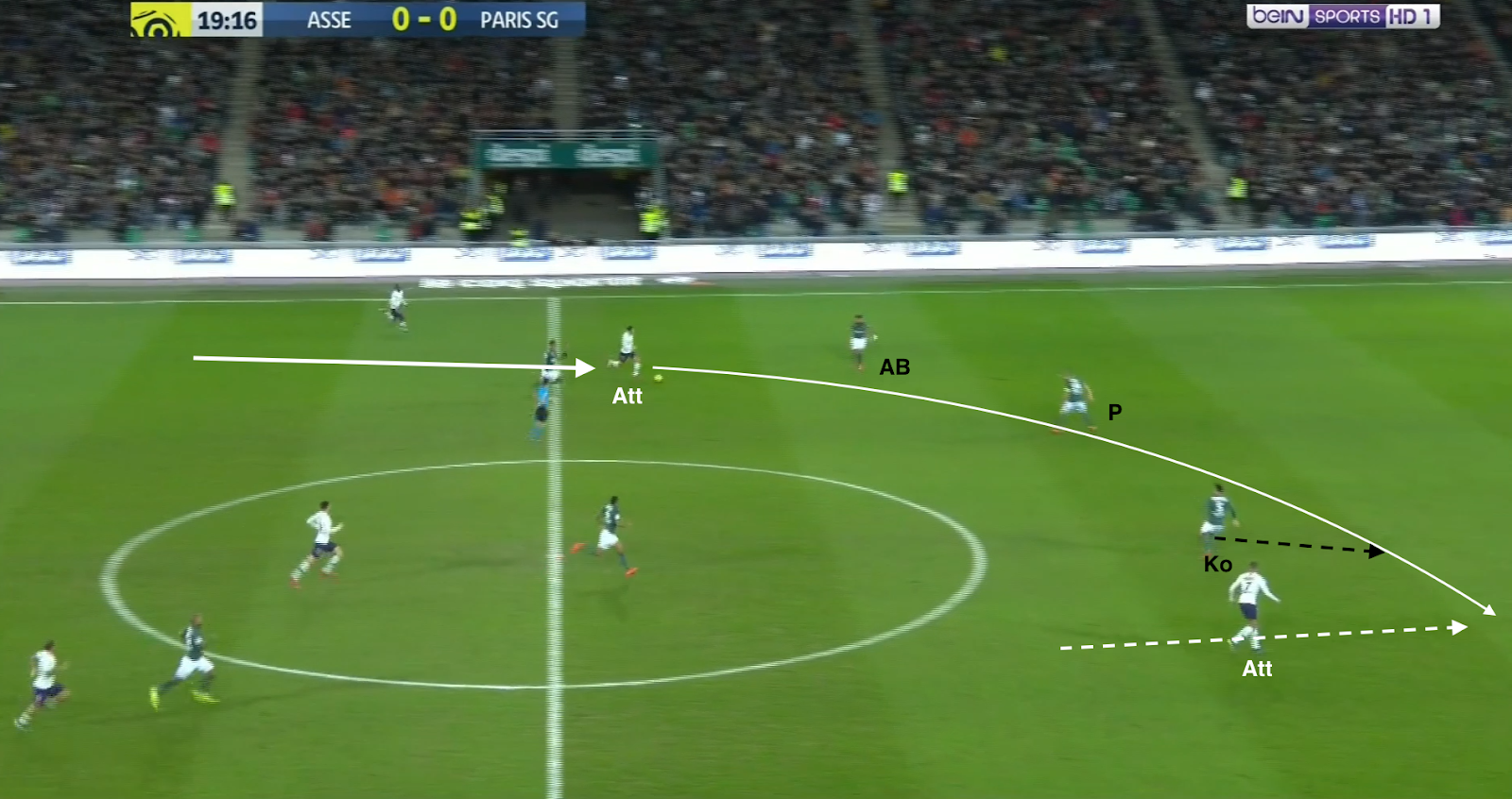 Nous avons pu voir sur les trois exemples précédents des attaques placées et des contres des deux équipes. Et il y a une nette différence : les Parisiens ont réussi plus souvent ce qu'ils ont essayé de faire. Mais l'exemple illustrant le mieux les différences entre les deux équipes intervient à la 54e minute, avec l'ASSE qui bénéficie d'un coup franc :