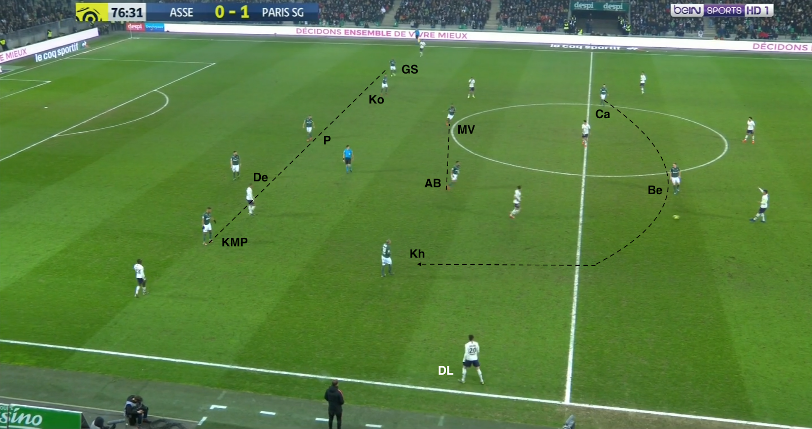 Avec l'entrée de Beric à la place de Hamouma, le 5-2-3 stéphanois a été maintenu mais c'est Khazri qui s'est décalé à droite, laissant la place au Slovène dans l'axe de l'attaque. Sur cette image il est assez bas pour compenser la montée du latéral gauche parisien.