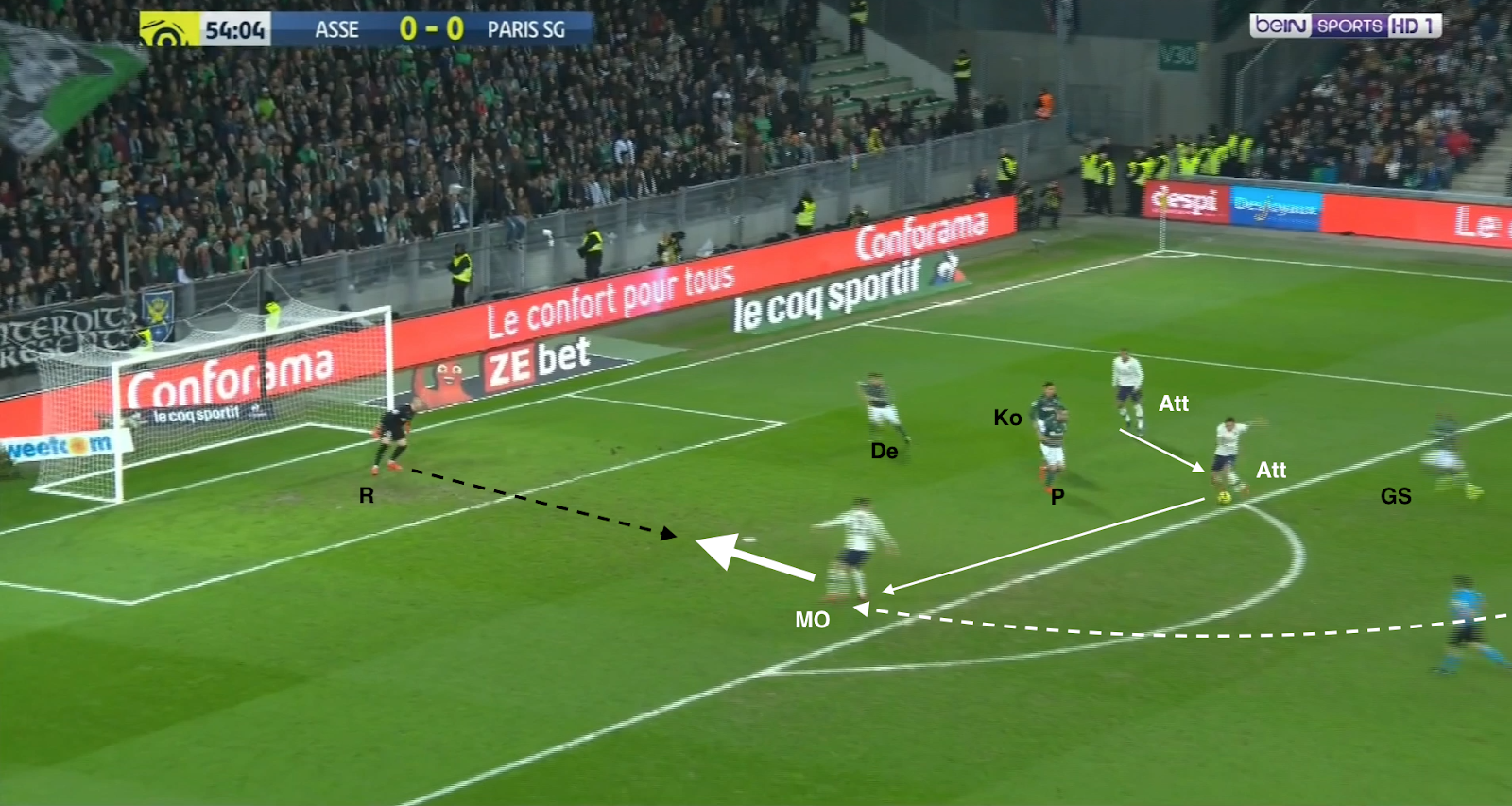 ... après que les deux attaquants ont combiné pour contourner les 3 défenseurs stéphanois très mal positionnés. Heureusement Ruffier sent le coup et sort vite pour fermer l'angle de tir, repoussant ainsi la frappe du Parisien.