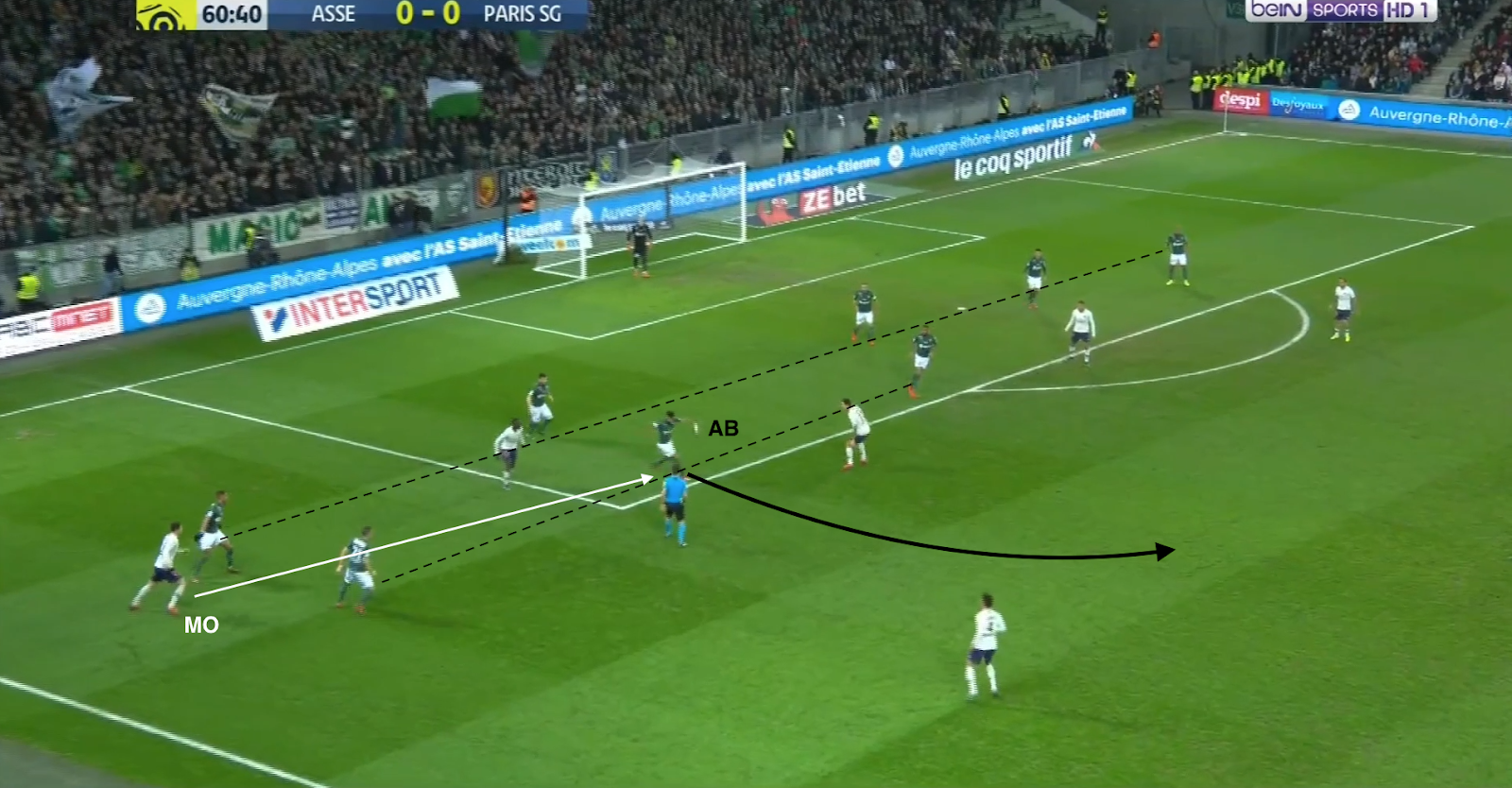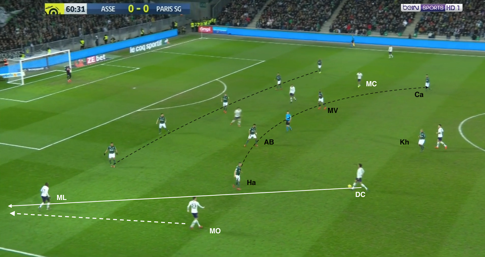 ... et il décale Hamouma à droite. La défense parisienne à 5 est bien en place, 2 milieux sont revenus aussi. Les Stéphanois sont bien présents, mais ce n'est plus une situation de contre. Néanmoins l'appel de Gabriel Silva venant du côté opposé est bien vu par Hamouma, pour une des rares occasions des Verts.