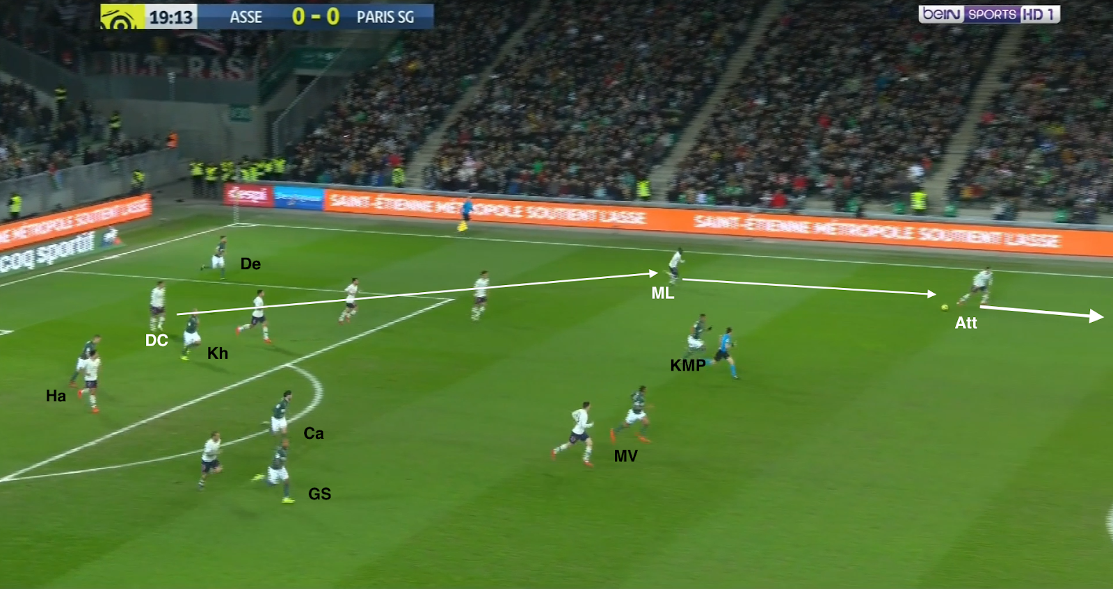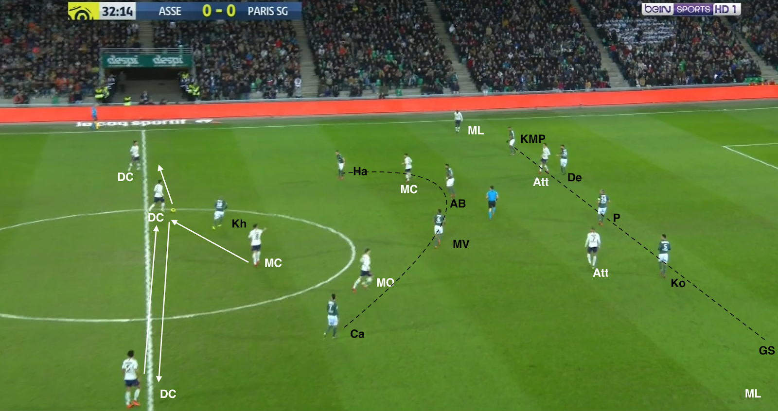 Les deux équipes ont démarré le match avec des défenses à 3, au 3-4-1-2 désormais habituel du côté de l'ASSE, le PSG ayant répondu avec un 3-5-2. Les systèmes étant symétriques et se neutralisant, la différence est faite par l'animation et l'approche tactique. Par exemple, une équipe peut choisir d'être en supériorité dans un couloir et de construire ses attaques à partir de là, pendant qu'une autre peut décider de subir et jouer vite les contres. Comme dans cette action qui commence à la 19e avec une relance de Ruffier pour Debuchy :