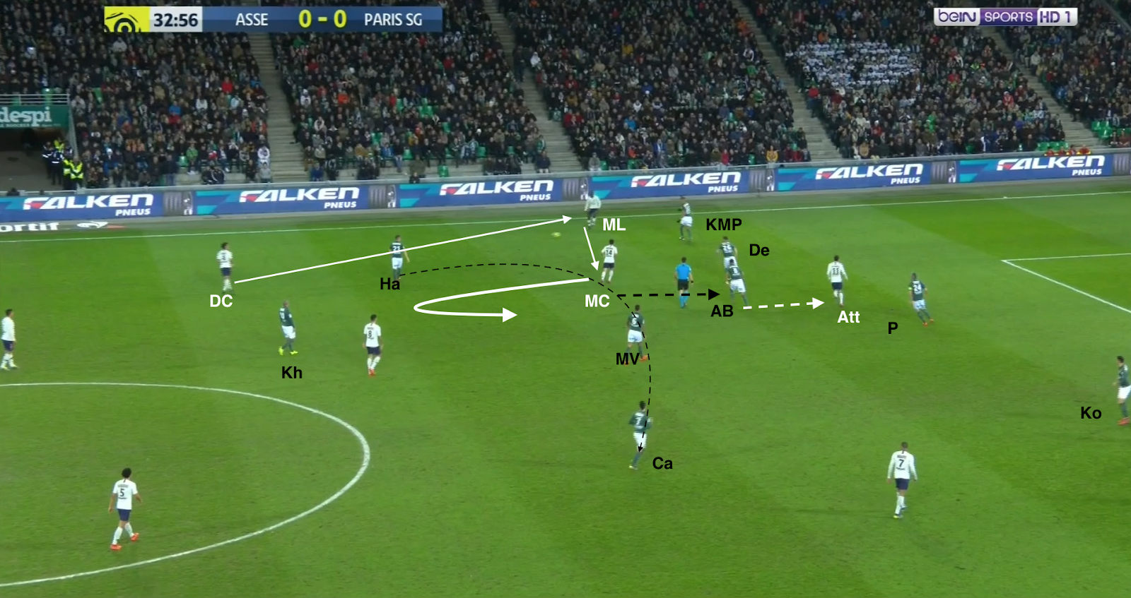 ... et sert ensuite Cabella, qui lance en première intention Hamouma en profondeur, l'attaquant stéphanois ayant démarré sa course dès qu'il avait donné le ballon à KMP. Un beau jeu collectif dans ce couloir droit mais qui a l'inconvénient d'avoir utilisé tous les éléments offensifs de l'ASSE :