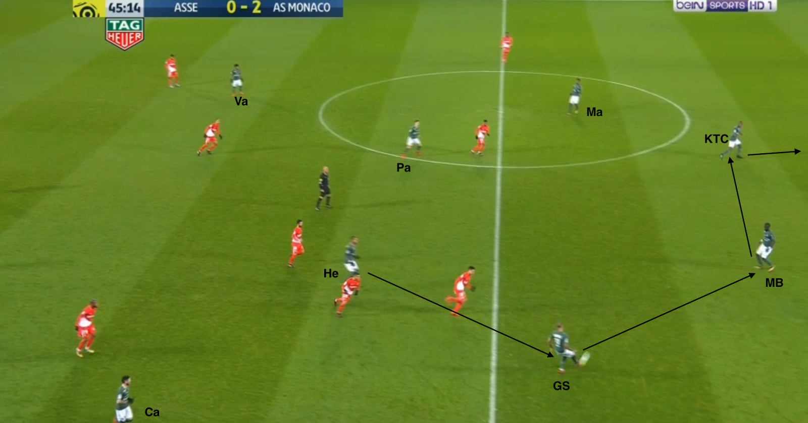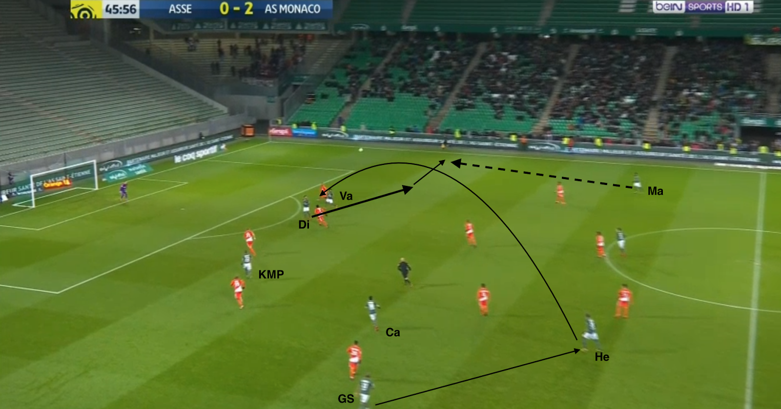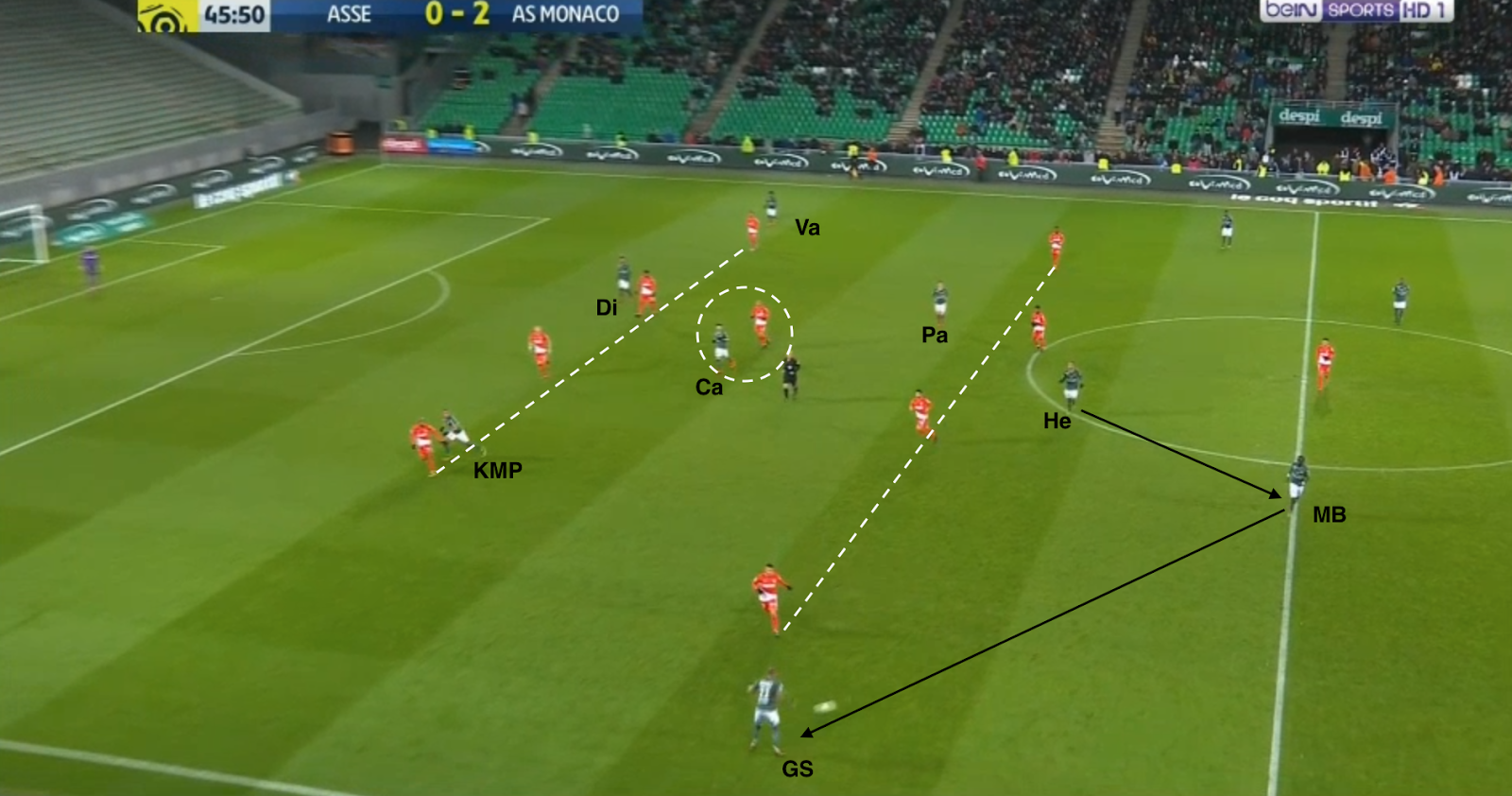 ... qui change de côté via MBengue jusqu'à Gabriel Silva. Sur cette image on remarque que Monaco est passé dans un 4-1-4-1, avec un milieu axial entre les lignes, au marquage de Cabella. Silva redonne le ballon à Hernani...