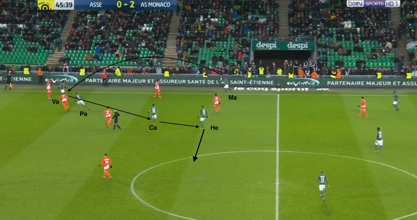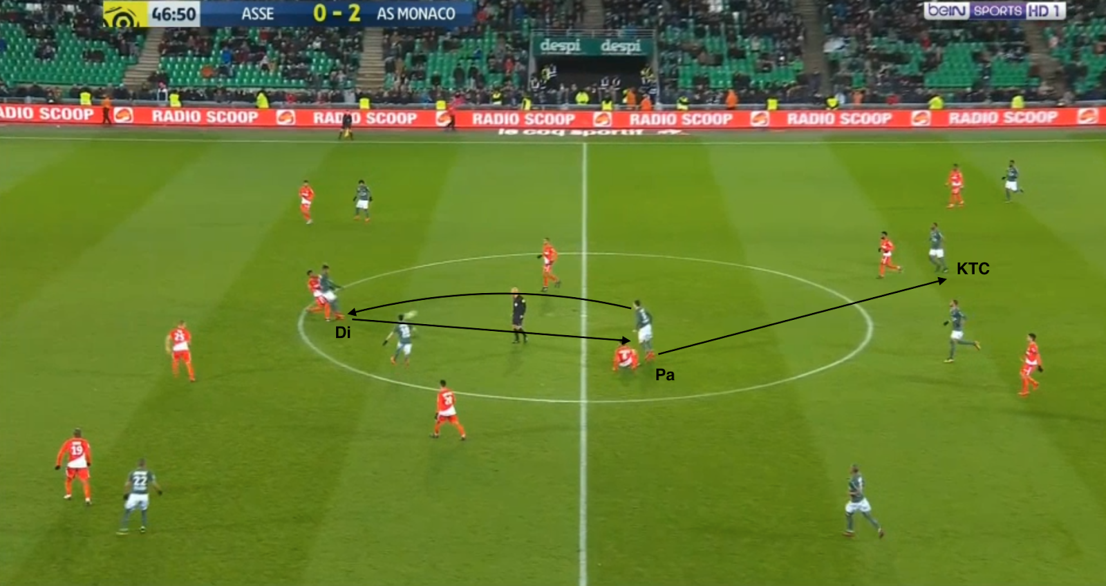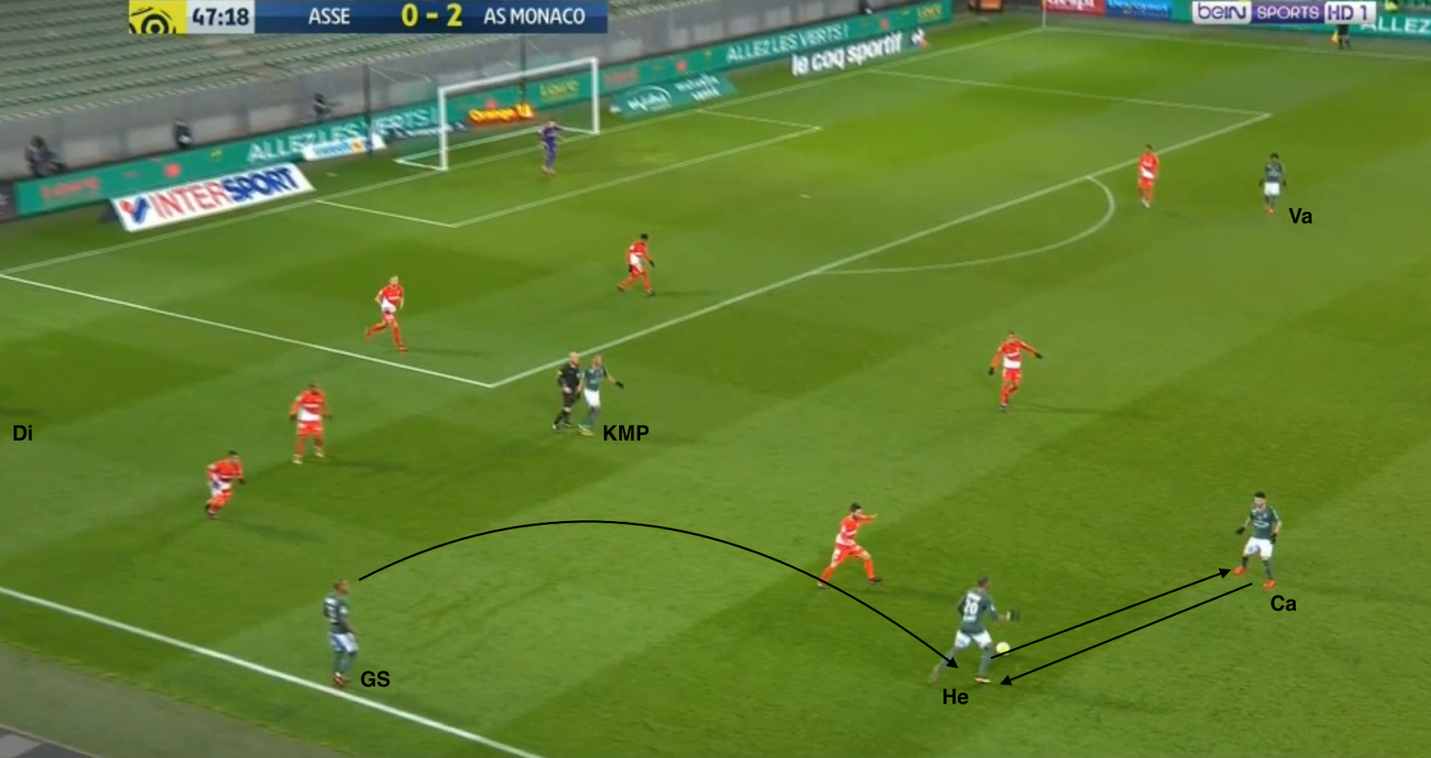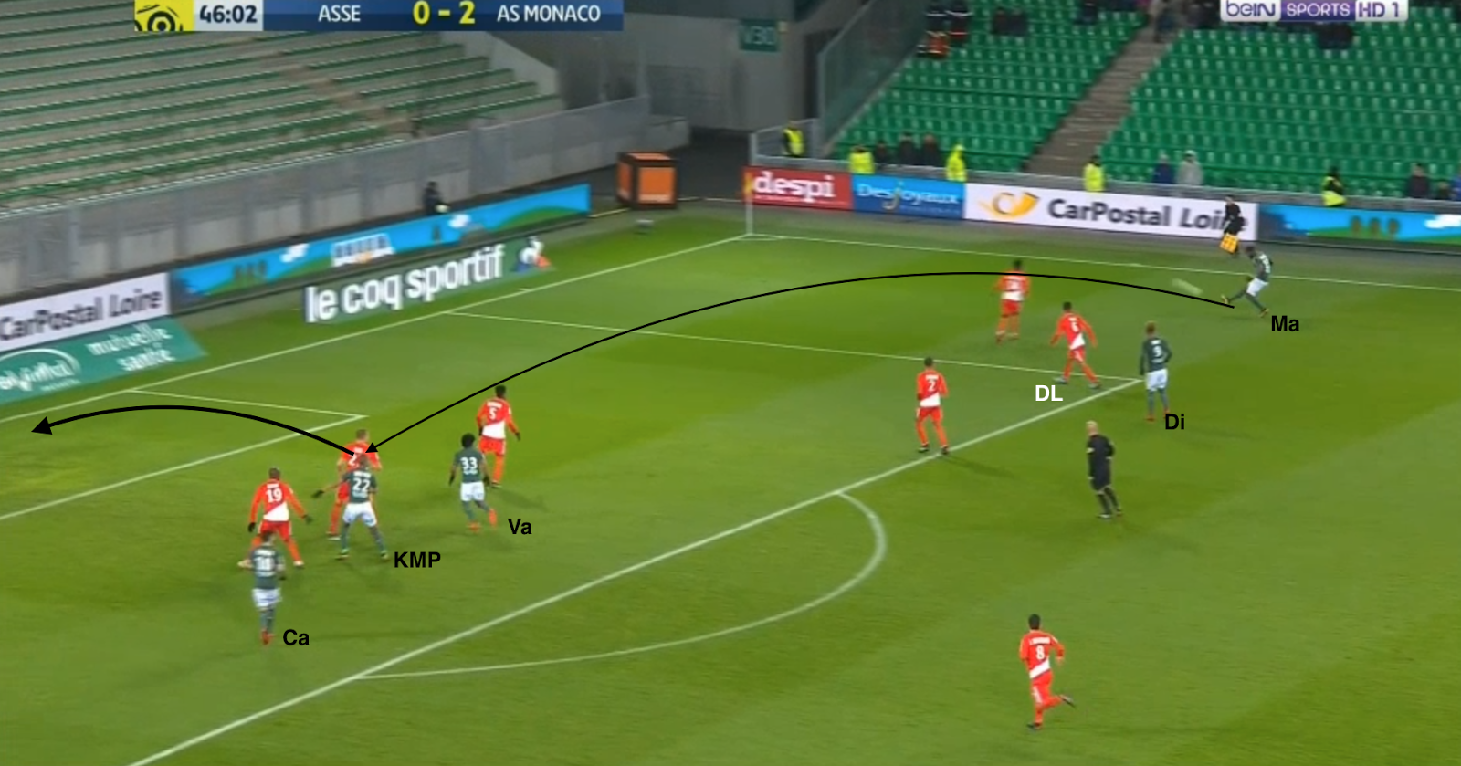 ... qui change de côté via MBengue jusqu'à Gabriel Silva. Sur cette image on remarque que Monaco est passé dans un 4-1-4-1, avec un milieu axial entre les lignes, au marquage de Cabella. Silva redonne le ballon à Hernani...
