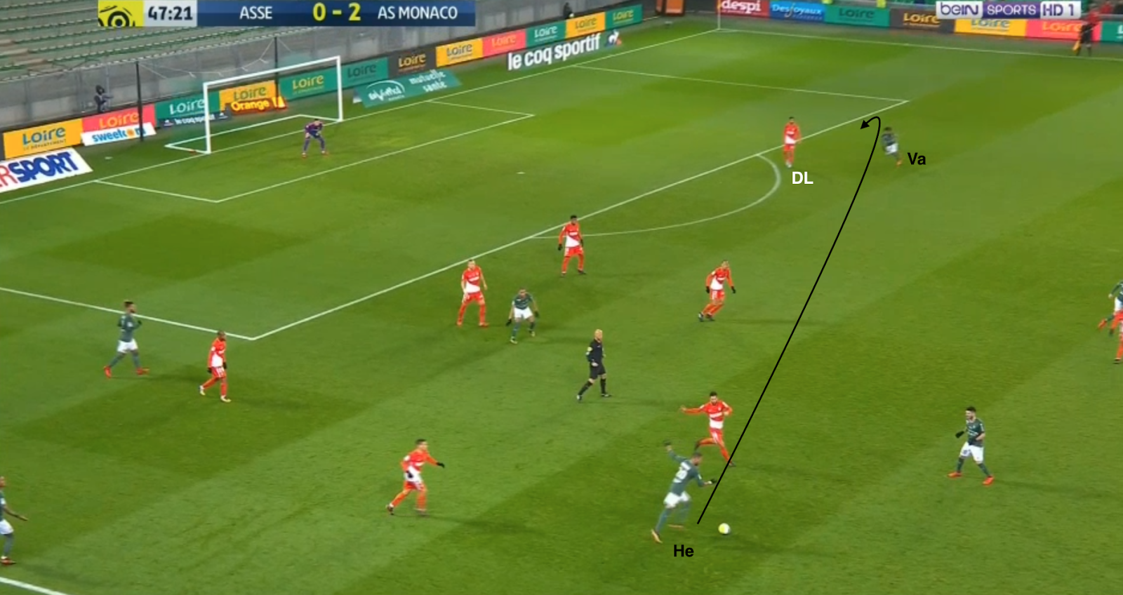 ... avant de chercher Vagner sur le côté opposé. Le jeune ailier Stéphanois anticipe mal la trajectoire du ballon qui est facilement gagné par le défenseur latéral...