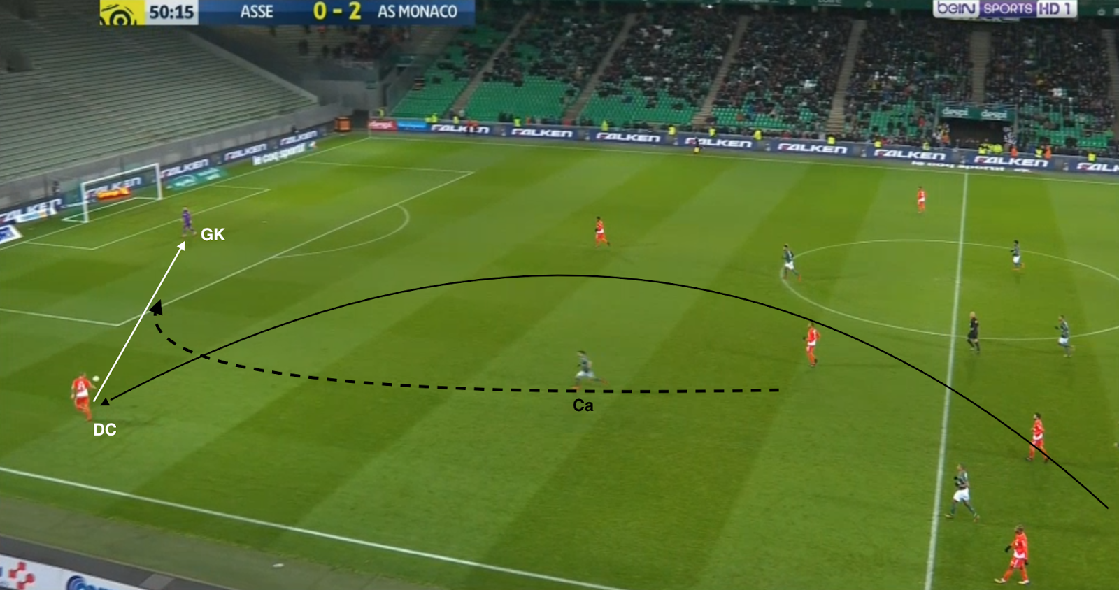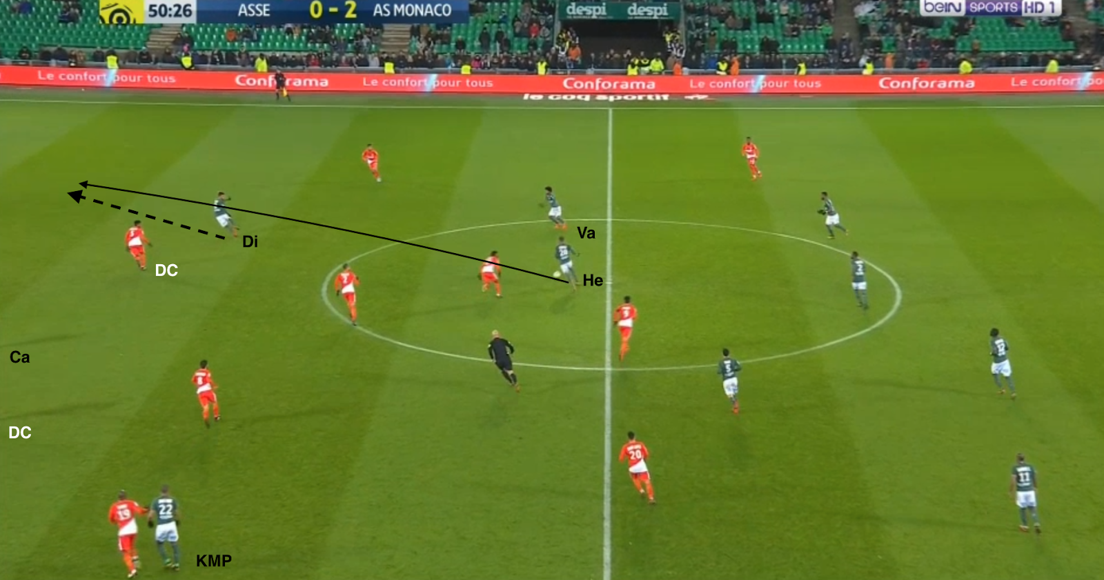 Sur cette image on remarque le (4-)4-2 Monégasque et le 4-3-(3) Stéphanois, avec un Hernani pointe basse qui demande le ballon, sans être servi. C'est Pajot qui est recherché par son gardien, il gagne son duel de la tête, mais un défenseur adverse dégage en touche.