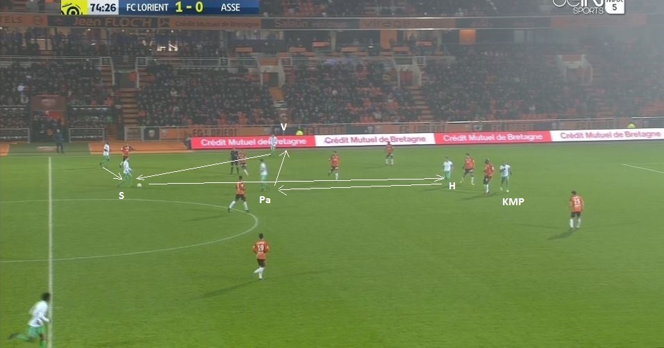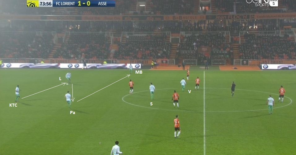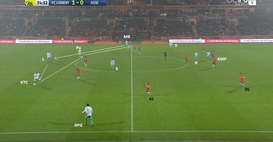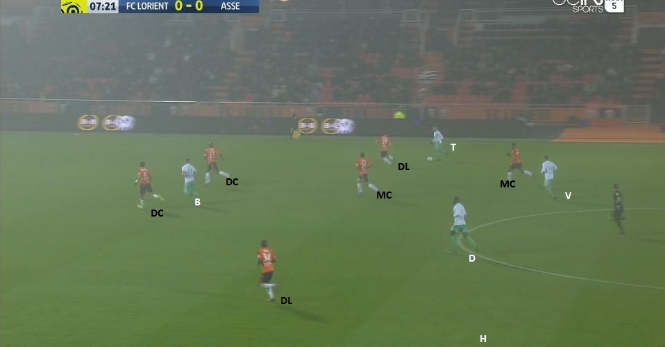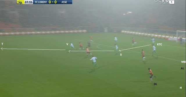 A noter que 8 Verts défendaient contre 7 Lorientais et que donc Tannane et Beric étaient au centre du terrain avec trois défenseurs adverses. Tannane monte avec le ballon dans le couloir :