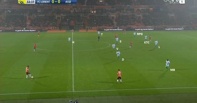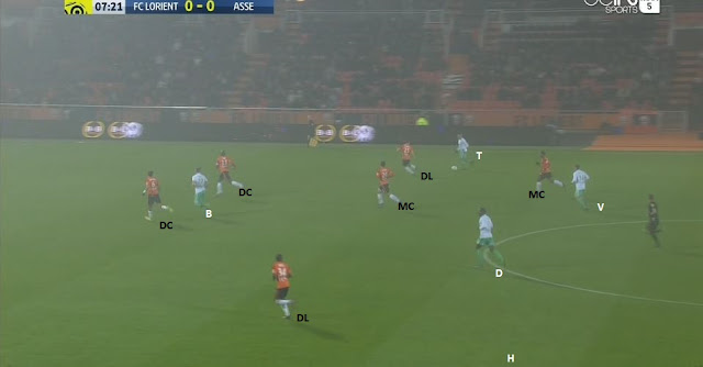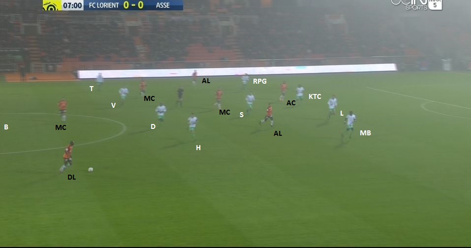 Pour ce retour au 4-3-3 "classique", le choix tactique des Verts a été de défendre bas et attendre les Lorientais, qui jouaient dans le même système, éventuellement en les punissant en contre. Enfin, c'est ce qu'on peut déduire des premières 10 minutes du match, avec une possession stéphanoise de seulement 43%. A titre d'exemple, à la 8ème minute on défend en 4-1-4-1, le jeu adverse va vers notre gauche :