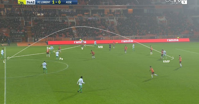 Celui-ci le redonne à Veretout, mais cette fois-ci MBengue a eu le temps de monter, donc le jeu en triangle avec Pajot fonctionne et notre latéral est lancé dans son couloir. Malheureusement il n'est pas en confiance et au lieu d'essayer de passer en un contre un, il revient et via Veretout et Selnaes le ballon arrive à Lacroix :
