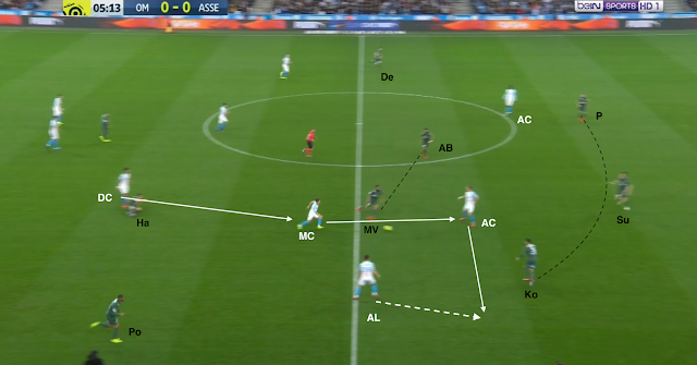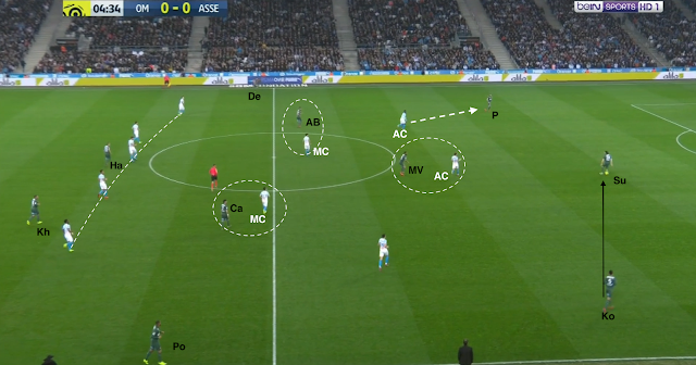 Défense à 5 pour contenir les deux avant-centres et les deux joueurs de couloir. Marquage individuel entre les milieux axiaux, mais aussi d'un avant-centre marseillais sur M'Vila pendant que l'autre cherche Perrin. La construction des Verts doit donc passer par une prise de risque, par des passes vers des joueurs suivis de près par un adversaire :