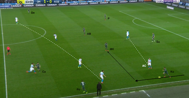 "Son" avant-centre reste à côté de Kolo pendant que l'autre est discipliné et s'en va chercher Perrin, ce qui libère un angle de passe vers Aït Bennasser. M'Vila est recherché par un milieu axial, ce qui permet aux Stéphanois de trouver Cabella et Polomat à gauche - dans deux passes les deux premières lignes du bloc marseillais ont été franchies. Cabella laisse le ballon aller vers le côté et fait un appel dans l'axe :